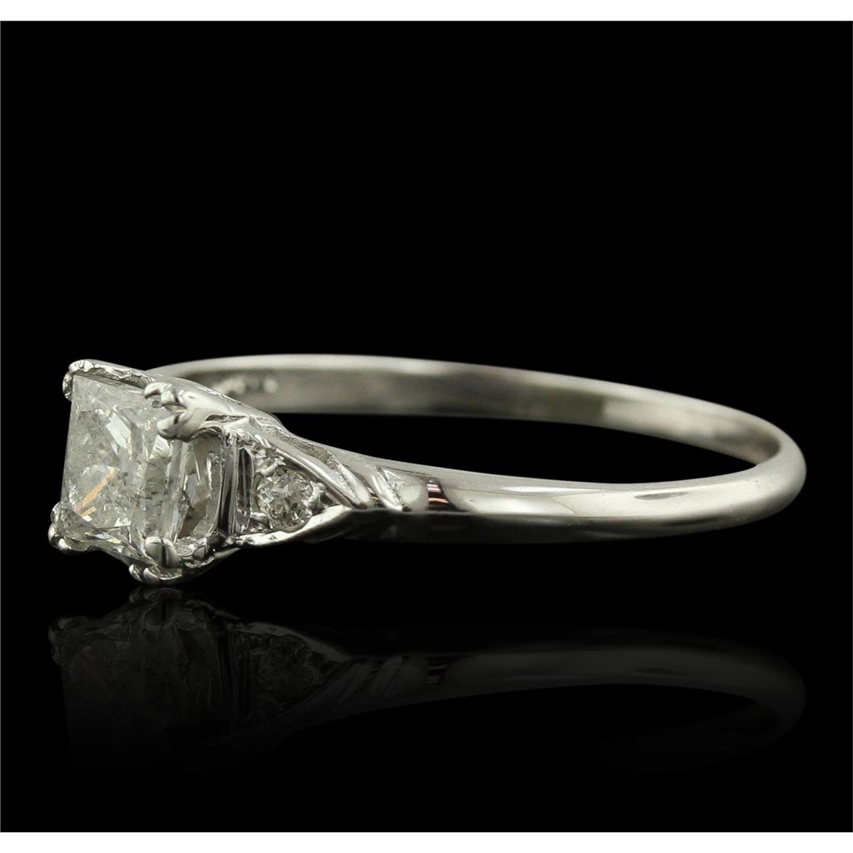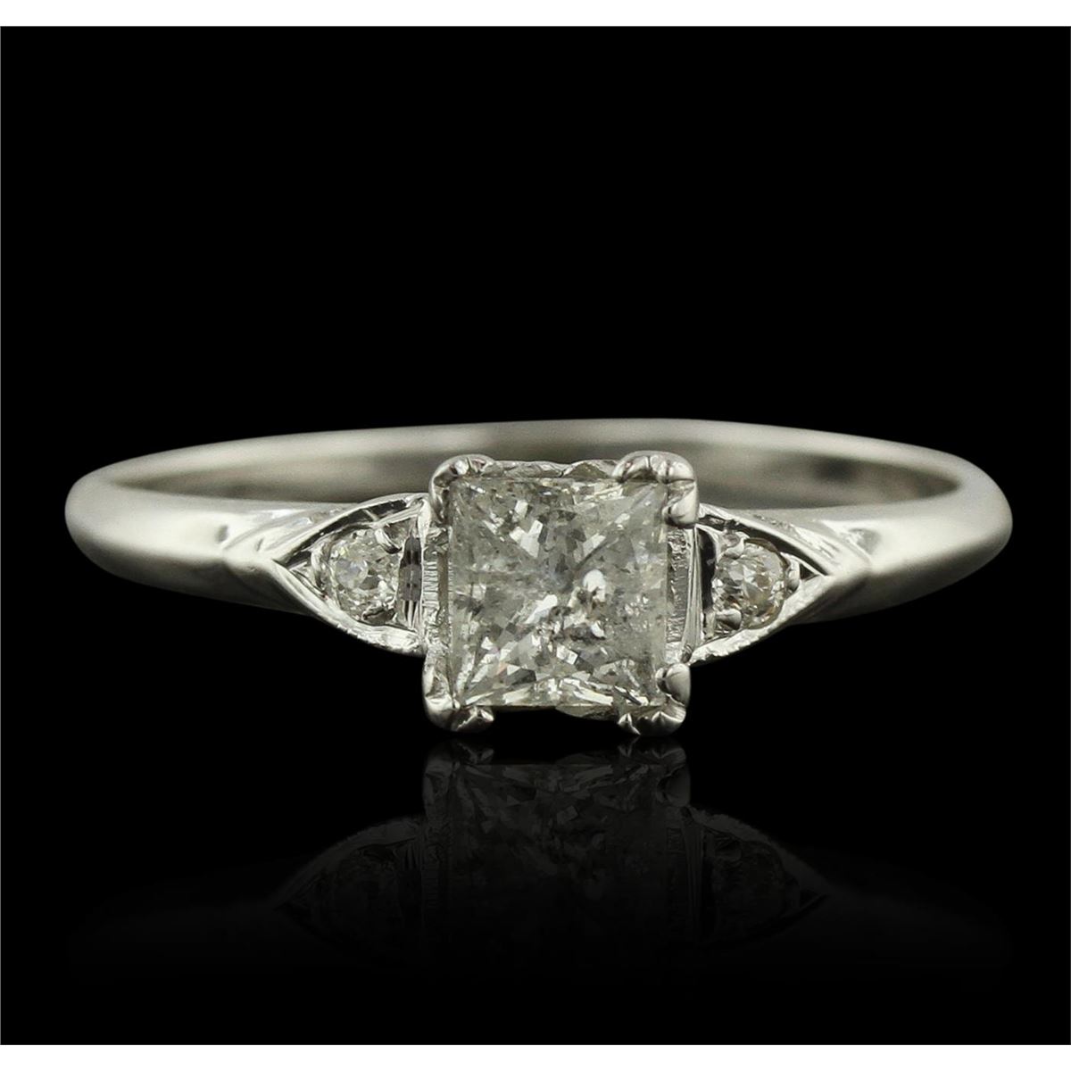 One electronically tested 14KT white gold ladies cast diamond unity ring with a bright polish finish. Condition is new, good workmanship. The featured diamond is accented by a single diamond on either side, completed by a one and one-half millimeter wide band. Identified with markings of "14K". Containing: One prong set princess cut diamond, measuring 4.60 x 4.35 x 3.40mm (depth est.), 10.00.%. GTCF approximate weight of 0.70ct with a faint blue fluorescence. Graded in the setting. Clarity: I-1. Color: 78.2%. Table 75.9%. Two prong set Old European cut diamonds, measuring 1.80 - 1.80 x 1.12mm (depth est.) approximate. Total Weight of 2 Stones = 0.06ct. Cutting style circa late 19th century. Graded in the setting. Clarity: SI-1 to SI-2. Color: H - I. Total Weight of Diamonds 0.76ct. Total Weight of Ring 1.94 grams. AIG Appraised at $4,595.00.