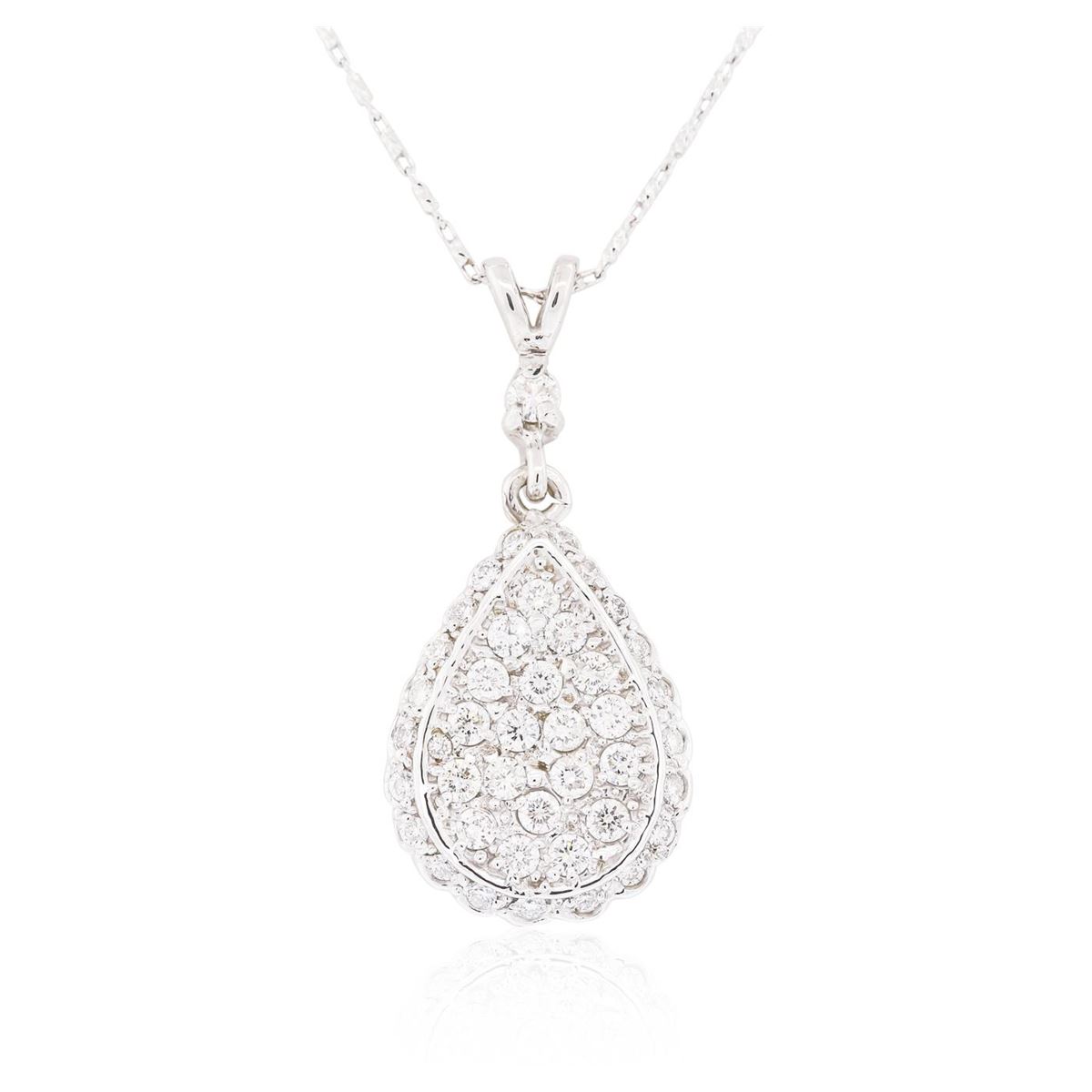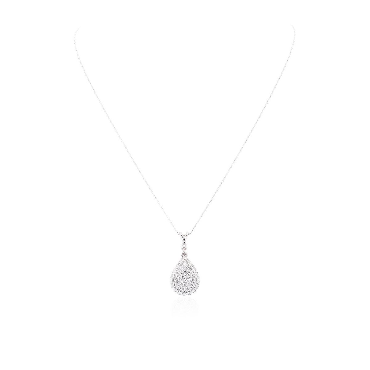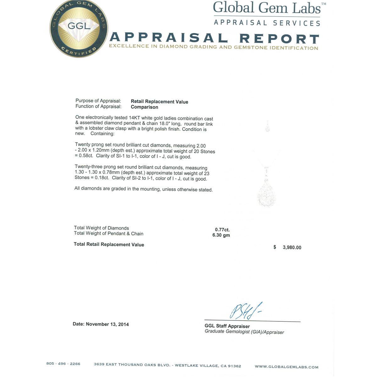 One electronically tested 14KT white gold ladies combination cast & assembled diamond pendant & chain 18.0" long, round bar link with a lobster claw clasp with a bright polish finish. Condition is new. Containing: Twenty prong set round brilliant cut diamonds, measuring 2.00 - 2.00 x 1.20mm (depth est.) approximate total weight of 20 Stones = 0.58ct. Clarity: SI-1 to I-1. Color: I - J, Cut is Good. Twenty-Three prong set round brilliant cut diamonds, measuring 1.30 - 1.30 x 0.78mm (depth est.) approximate total weight of 23 Stones = 0.18ct. Clarity: SI-2 to I-1. Color: I - J, Cut is Good. All diamonds are graded in the mounting, unless otherwise stated. Total Weight of Diamonds 0.77ct. Total Weight of Pendant & Chain 6.30 grams. GGL Appraised at $3,980.00.