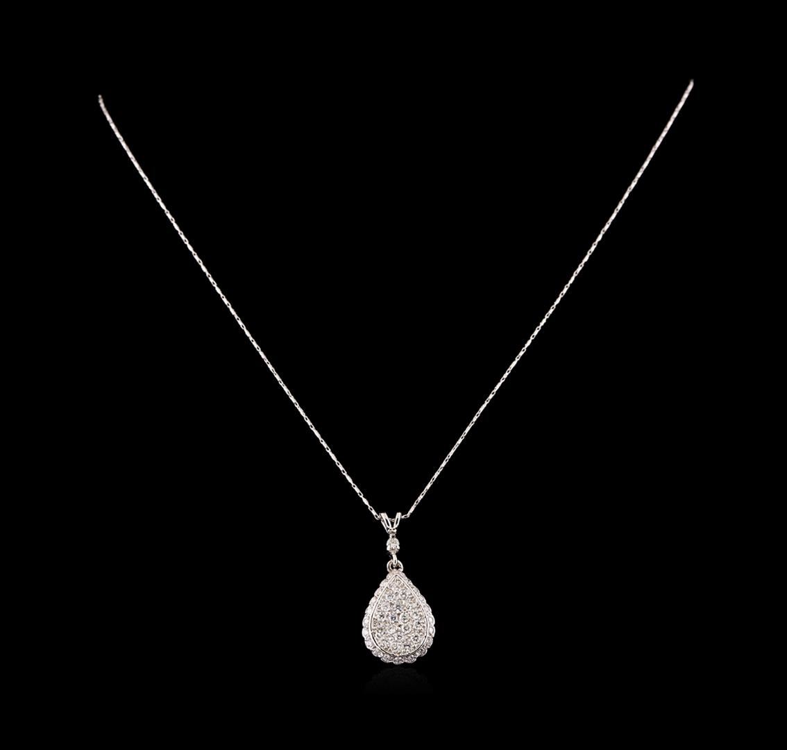One electronically tested 14KT white gold ladies combination cast & assembled diamond pendant & chain 18.0" long, round bar link with a lobster claw clasp with a bright polish finish. Condition is new. Containing: Twenty prong set round brilliant cut diamonds, measuring 2.00 - 2.00 x 1.20mm (depth est.) approximate total weight of 20 Stones = 0.58ct. Clarity: SI-1 to I-1. Color: I - J, Cut is Good. Twenty-Three prong set round brilliant cut diamonds, measuring 1.30 - 1.30 x 0.78mm (depth est.) approximate total weight of 23 Stones = 0.18ct. Clarity: SI-2 to I-1. Color: I - J, Cut is Good. All diamonds are graded in the mounting, unless otherwise stated. Total Weight of Diamonds 0.77ct. Total Weight of Pendant & Chain 6.30 grams. GGL Appraised at $3,980.00.