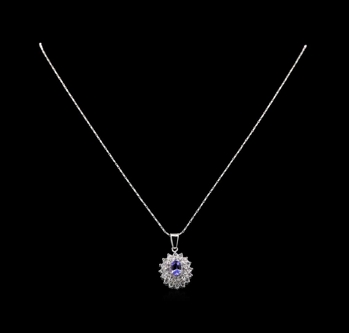 One electronically tested 14KT white gold ladies cast tanzanite and diamond pendant & chain 18.0" long, with a spring ring clasp with a bright polish finish. Identified with markings of "14K". Condition is new. Containing: One prong set oval modified brilliant cut natural tanzanite, measuring 7.30 x 4.80 x 3.12mm, approximate weight of 0.77ct., clarity is eye clean, type I, medium light, very slightly grayish, violet color, (GIA V 4/3), cut is good. Twenty-Eight prong set round brilliant cut diamonds, measuring 2.00 - 1.80 x 1.14mm (depth est.) approximate total weight of 28 Stones = 0.70ct. Clarity: SI-1 to SI-2. Color: I - J, Cut is Good. Colored gemstones are presumed to have been subjected to commonly used enhancement processes. All diamonds and colored gemstones are graded in the mounting, unless otherwise stated. Total Weight of Colored Stones 0.77ct. Total Weight of Diamonds 0.70ct. Total Weight of Pendant & Chain 6.80 grams. GGL Appraised at $4,090.00.