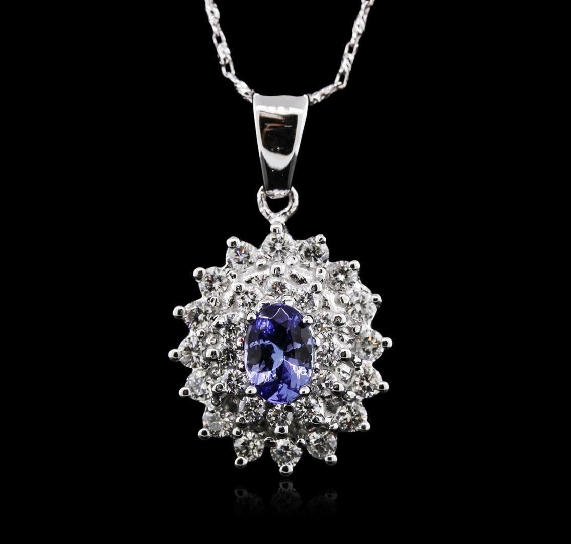 One electronically tested 14KT white gold ladies cast tanzanite and diamond pendant & chain 18.0" long, with a spring ring clasp with a bright polish finish. Identified with markings of "14K". Condition is new. Containing: One prong set oval modified brilliant cut natural tanzanite, measuring 7.30 x 4.80 x 3.12mm, approximate weight of 0.77ct., clarity is eye clean, type I, medium light, very slightly grayish, violet color, (GIA V 4/3), cut is good. Twenty-Eight prong set round brilliant cut diamonds, measuring 2.00 - 1.80 x 1.14mm (depth est.) approximate total weight of 28 Stones = 0.70ct. Clarity: SI-1 to SI-2. Color: I - J, Cut is Good. Colored gemstones are presumed to have been subjected to commonly used enhancement processes. All diamonds and colored gemstones are graded in the mounting, unless otherwise stated. Total Weight of Colored Stones 0.77ct. Total Weight of Diamonds 0.70ct. Total Weight of Pendant & Chain 6.80 grams. GGL Appraised at $4,090.00.