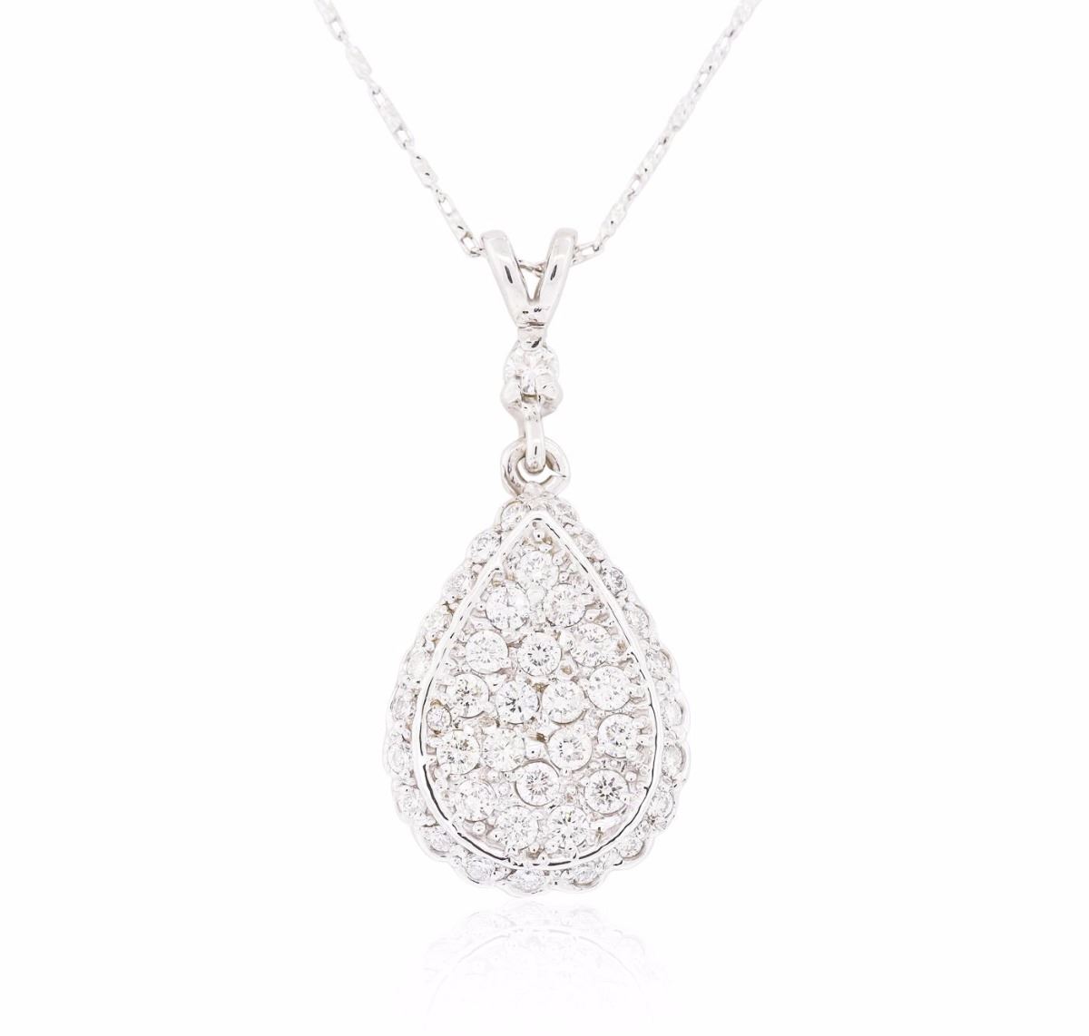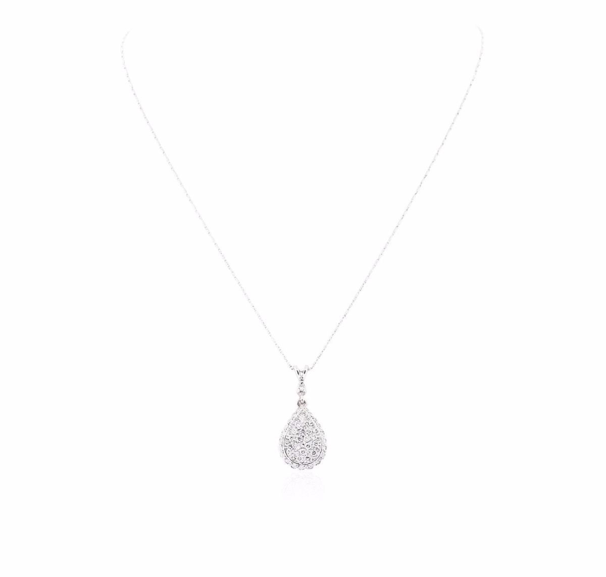 One electronically tested 14KT white gold ladies combination cast & assembled diamond pendant & chain 18.0" long, round bar link with a lobster claw clasp with a bright polish finish. Condition is new. Containing: Twenty prong set round brilliant cut diamonds, measuring 2.00 - 2.00 x 1.20mm (depth est.) approximate total weight of 20 Stones = 0.58ct. Clarity: SI-1 to I-1. Color: I - J, Cut is Good. Twenty-Three prong set round brilliant cut diamonds, measuring 1.30 - 1.30 x 0.78mm (depth est.) approximate total weight of 23 Stones = 0.18ct. Clarity: SI-2 to I-1. Color: I - J, Cut is Good. All diamonds are graded in the mounting, unless otherwise stated. Total Weight of Diamonds 0.77ct. Total Weight of Pendant & Chain 6.30 grams. GGL Appraised at $3,980.00.