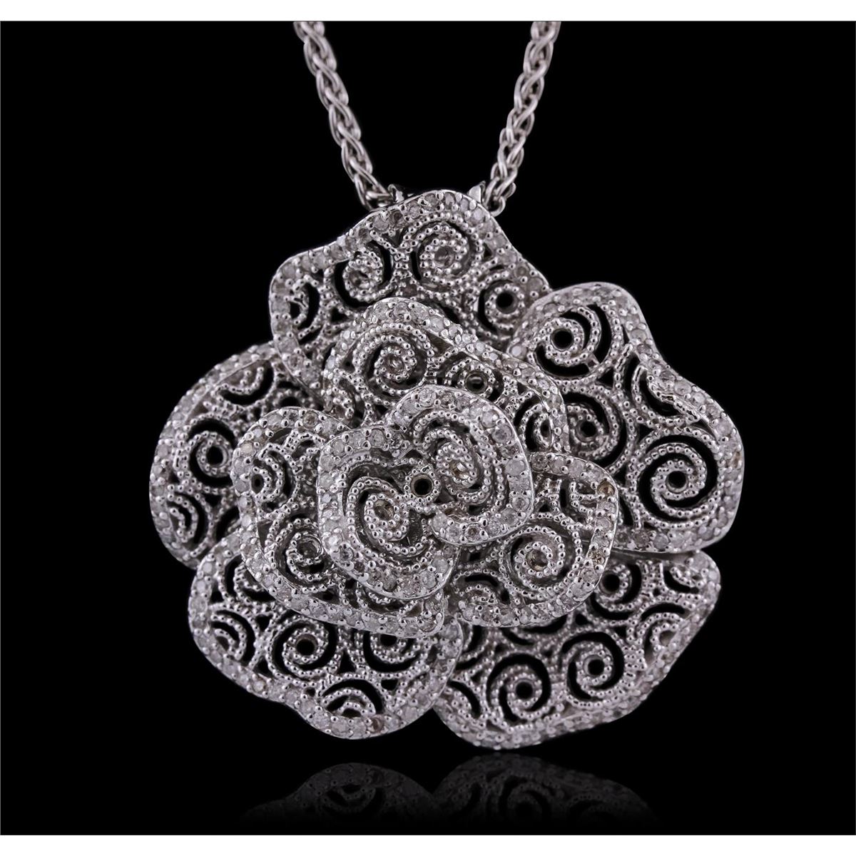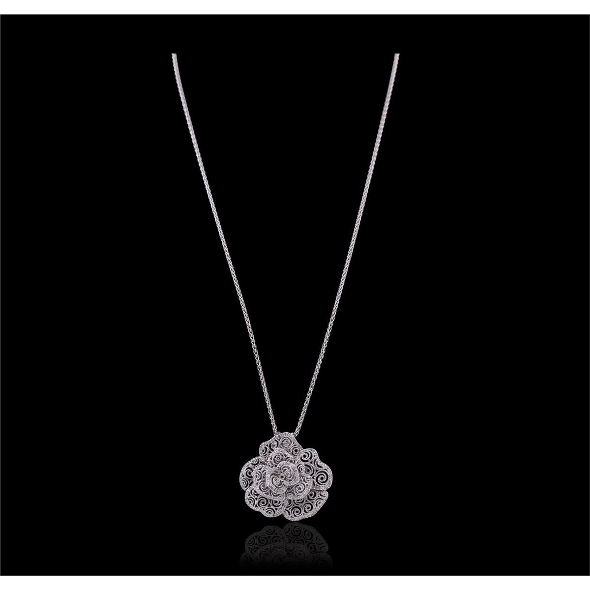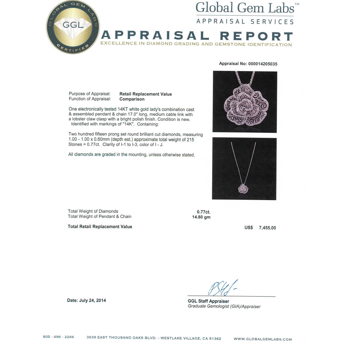 One electronically tested 14KT white gold ladies combination cast & assembled pendant & chain 17.0" long, medium cable link with a lobster claw clasp with a bright polish finish. Condition is new. Identified with markings of "14K". Containing: Two Hundred Fifteen prong set round brilliant cut diamonds, measuring 1.00 - 1.00 x 0.60mm (depth est.) approximate total weight of 215 Stones = 0.77ct. Clarity: I-1 to I-3. Color: I - J. All diamonds are graded in the mounting, unless otherwise stated. Total Weight of Diamonds 0.77ct. Total Weight of Pendant & Chain 14.80 grams. GGL Appraised at $7,455.00.