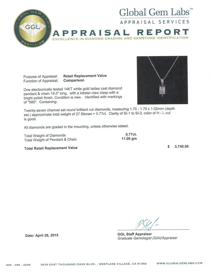 One electronically tested 14KT white gold ladies cast diamond pendant & chain 18.0" long, with a lobster claw clasp with a bright polish finish. Identified with markings of "585". Condition is new. Containing: Twenty-Seven channel set round brilliant cut diamonds, measuring 1.70 - 1.70 x 1.02mm (depth est.) approximate total weight of 27 Stones = 0.77ct. Clarity: SI-1 to SI-2. Color: H - I, Cut is Good. All diamonds are graded in the mounting, unless otherwise stated. Total Weight of Diamonds 0.77ct. Total Weight of Pendant & Chain 11.00 grams. GGL Appraised at $3,740.00.