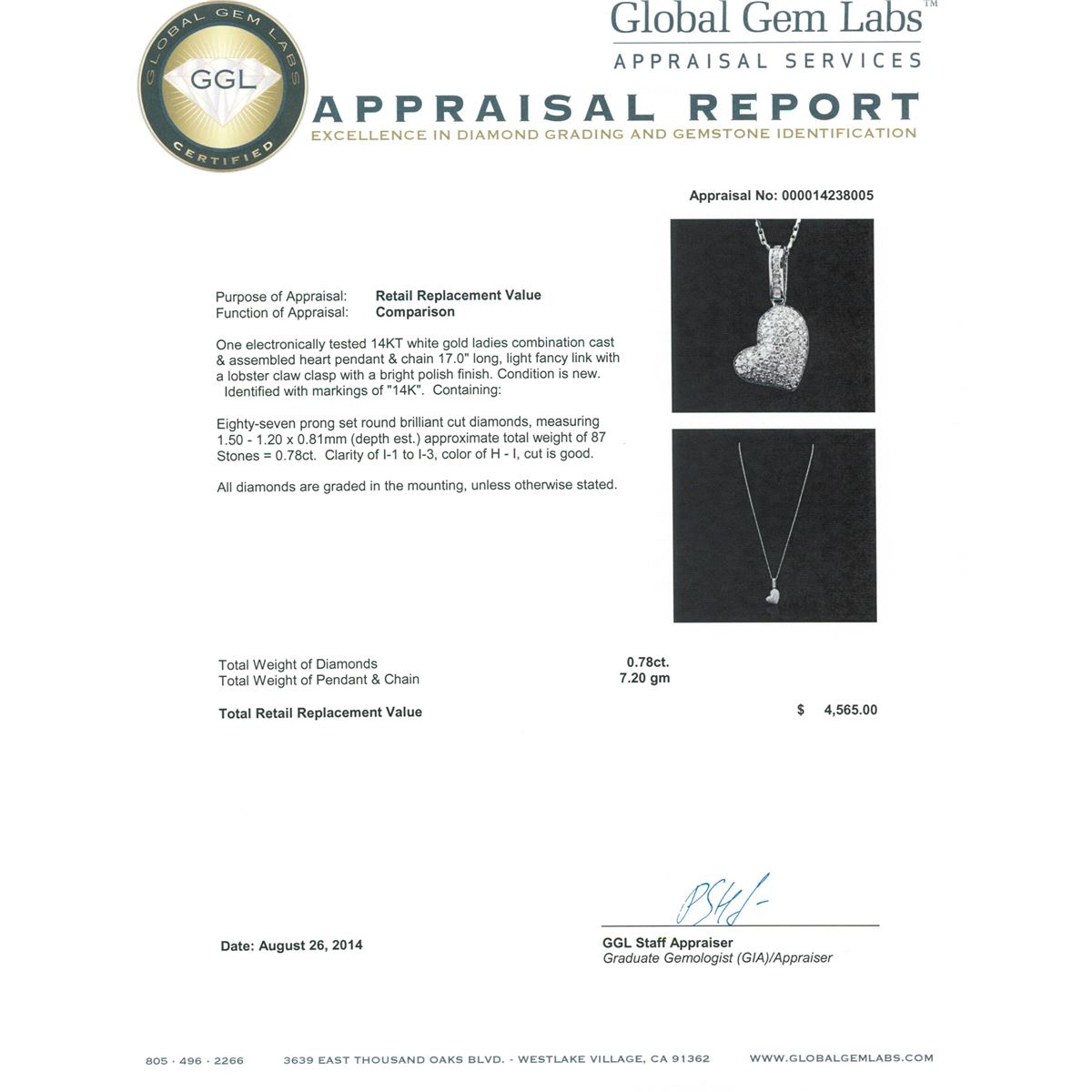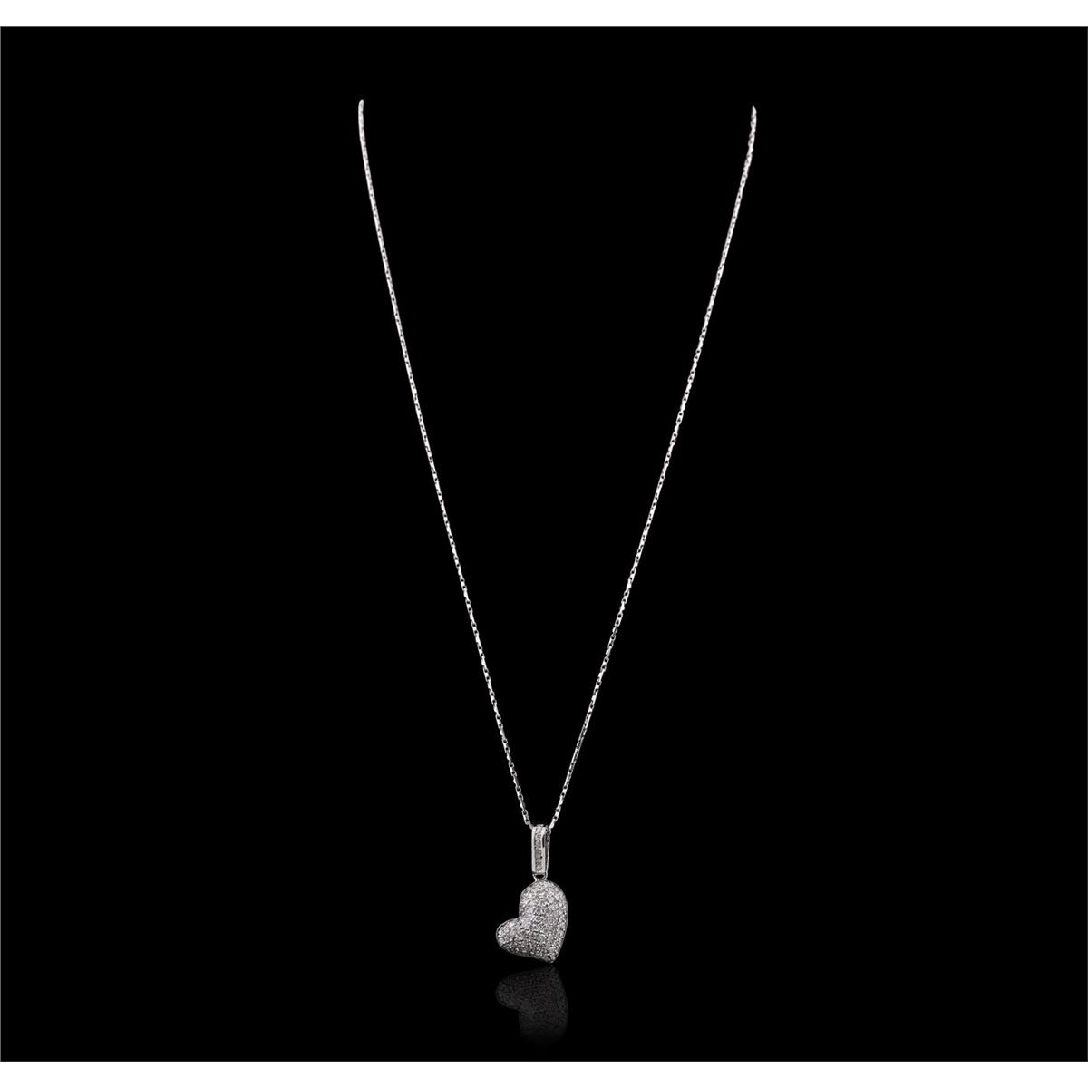 One electronically tested 14KT white gold ladies combination cast & assembled heart pendant & chain 17.0" long, light fancy link with a lobster claw clasp with a bright polish finish. Identified with markings of "14K". Condition is new. Containing: Eighty-Seven prong set round brilliant cut diamonds, measuring 1.50 - 1.20 x 0.81mm (depth est.) approximate total weight of 87 Stones = 0.78ct. Clarity: I-1 to I-3. Color: H - I, Cut is Good. All diamonds are graded in the mounting, unless otherwise stated. Total Weight of Diamonds 0.78ct. Total Weight of Pendant & Chain 7.20 grams. GGL Appraised at $4,565.00.