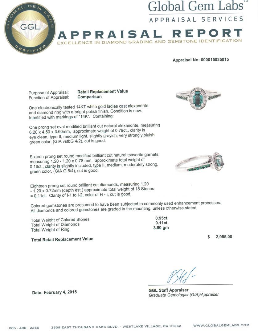 One electronically tested 14KT white gold ladies cast alexandrite and diamond ring with a bright polish finish. Identified with markings of "14K". Condition is new. Containing: One prong set oval modified brilliant cut natural alexandrite, measuring 6.20 x 4.50 x 3.60mm, approximate weight of 0.79ct., clarity is eye clean, type II, medium light, slightly grayish, very strongly bluish green color, (GIA vstbG 4/2), cut is good. Sixteen prong set round modified brilliant cut natural tsavorite garnets, measuring 1.20 - 1.20 x 0.78 mm, approximate total weight of 0.16ct., clarity is slightly included, type II, medium, moderately strong, green color, (GIA G 5/4), cut is good. Eighteen prong set round brilliant cut diamonds, measuring 1.20 - 1.20 x 0.72mm (depth est.) approximate total weight of 18 Stones = 0.11ct. Clarity: I-1 to I-2. Color: H - I, Cut is Good. Colored gemstones are presumed to have been subjected to commonly used enhancement processes. All diamonds and colored gemstones are graded in the mounting, unless otherwise stated. Total Weight of Colored Stones 0.95ct. Total Weight of Diamonds 0.11ct. Total Weight of Ring 3.90 grams. GGL Appraised at $2,955.00.