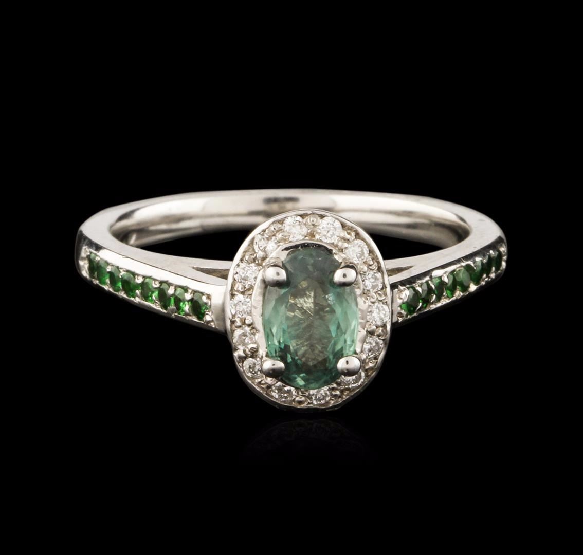 One electronically tested 14KT white gold ladies cast alexandrite and diamond ring with a bright polish finish. Identified with markings of "14K". Condition is new. Containing: One prong set oval modified brilliant cut natural alexandrite, measuring 6.20 x 4.50 x 3.60mm, approximate weight of 0.79ct., clarity is eye clean, type II, medium light, slightly grayish, very strongly bluish green color, (GIA vstbG 4/2), cut is good. Sixteen prong set round modified brilliant cut natural tsavorite garnets, measuring 1.20 - 1.20 x 0.78 mm, approximate total weight of 0.16ct., clarity is slightly included, type II, medium, moderately strong, green color, (GIA G 5/4), cut is good. Eighteen prong set round brilliant cut diamonds, measuring 1.20 - 1.20 x 0.72mm (depth est.) approximate total weight of 18 Stones = 0.11ct. Clarity: I-1 to I-2. Color: H - I, Cut is Good. Colored gemstones are presumed to have been subjected to commonly used enhancement processes. All diamonds and colored gemstones are graded in the mounting, unless otherwise stated. Total Weight of Colored Stones 0.95ct. Total Weight of Diamonds 0.11ct. Total Weight of Ring 3.90 grams. GGL Appraised at $2,955.00.