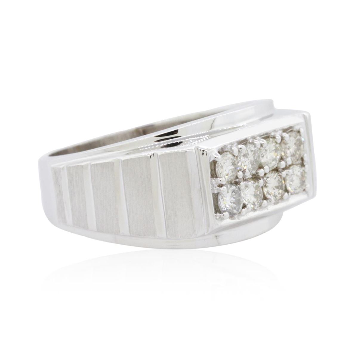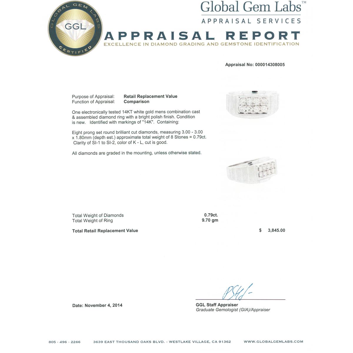 One electronically tested 14KT white gold mens combination cast & assembled diamond ring with a bright polish finish. Identified with markings of "14K". Condition is new. Containing: Eight prong set round brilliant cut diamonds, measuring 3.00 - 3.00 x 1.80mm (depth est.) approximate total weight of 8 Stones = 0.79ct. Clarity: SI-1 to SI-2. Color: K - L, Cut is Good. All diamonds are graded in the mounting, unless otherwise stated. Total Weight of Diamonds 0.79ct. Total Weight of Ring 9.70 grams. GGL Appraised at $3,845.00.