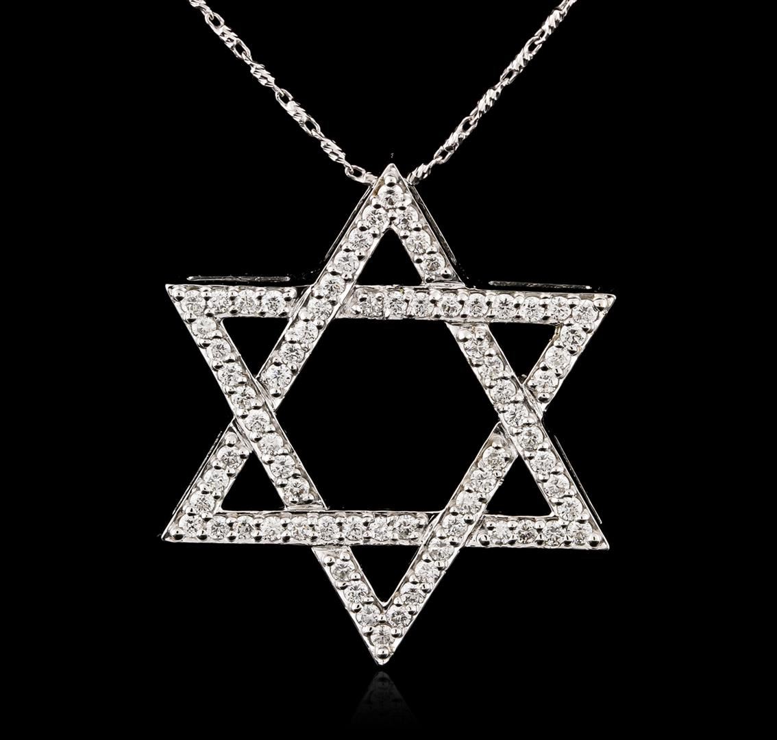 One electronically tested 14KT white gold ladies cast Star of David diamond pendant & chain 18.0" long, with a spring ring clasp with a bright polish finish. Identified with markings of "14K". Condition is new. Containing: Sixty-Four prong set round brilliant cut diamonds, measuring 1.50 - 1.50 x 0.90mm (depth est.) approximate total weight of 64 Stones = 0.79ct. Clarity: SI-1. Color: I - J, Cut is Good. All diamonds are graded in the mounting, unless otherwise stated. Total Weight of Diamonds 0.79ct. Total Weight of Pendant & Chain 6.50 grams. GGL Appraised at $3,225.00.