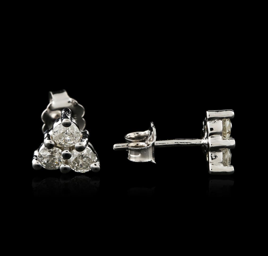 One pair electronically tested 14KT white gold ladies cast diamond earrings with friction posts with a bright polish finish. Identified with markings of "585". Condition is new. Containing: Six prong set round brilliant cut diamonds, measuring 3.20 - 3.20 x 1.92mm (depth est.) approximate total weight of 6 Stones = 0.80ct. Clarity: I-1 to I-2. Color: H - I, Cut is Good. Diamonds are graded in the mounting, unless otherwise stated. Total Weight of Diamonds 0.80ct. Total Weight of Earrings 1.70 grams. GGL Appraised at $1,135.00.