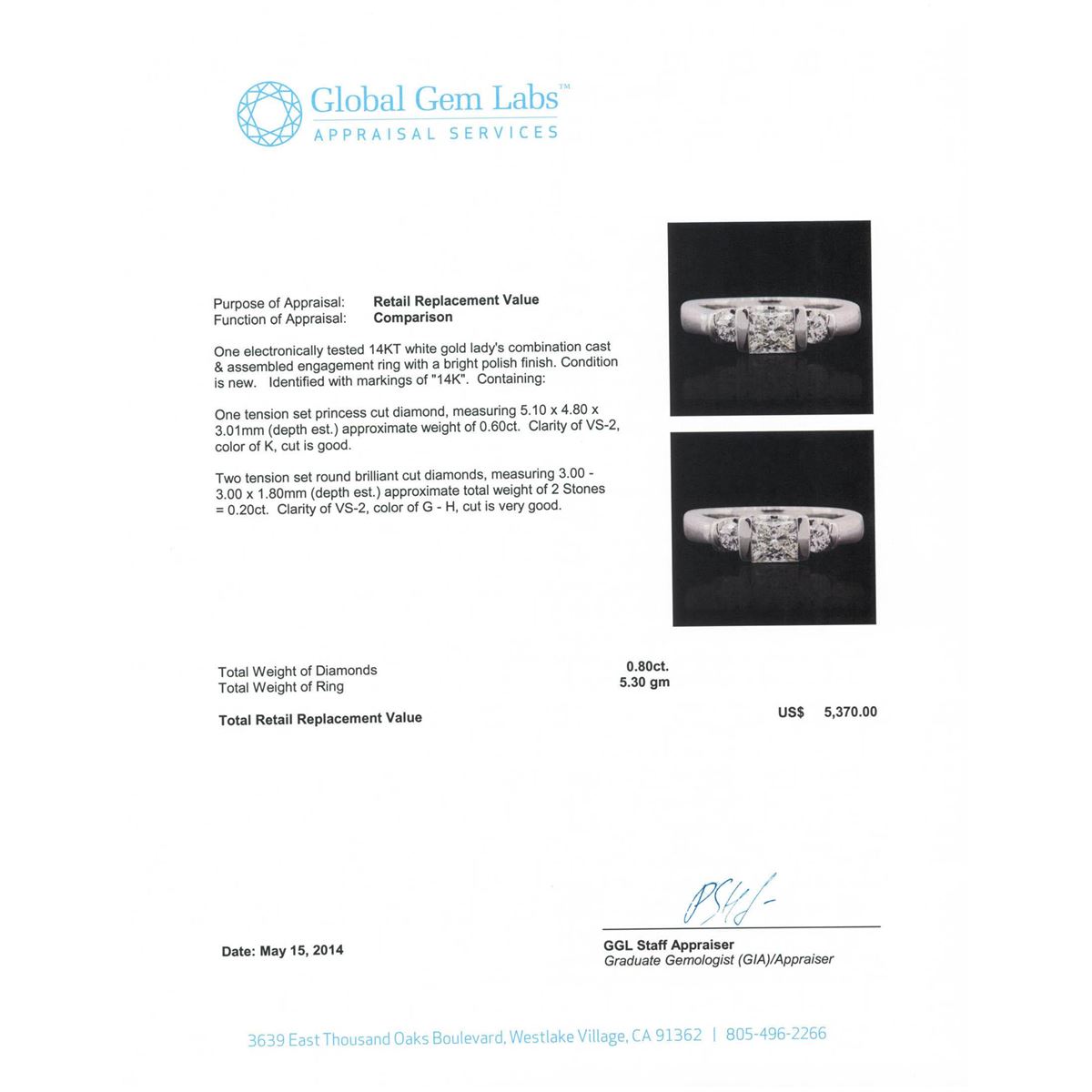 One electronically tested 14KT white gold Ladies combination cast & assembled engagement ring with a bright polish finish. Identified with markings of "14K". Condition is new. Containing: One tension set princess cut diamond, measuring 5.10 x 4.80 x 3.01mm (depth est.) approximate weight of 0.60ct. Clarity: VS-2. Color: K, Cut is Good. Two tension set round brilliant cut diamonds, measuring 3.00 - 3.00 x 1.80mm (depth est.) approximate. Total Weight of 2 Stones = 0.20ct. Clarity: VS-2. Color: G - H, Cut is Very Good. Total Weight of Diamonds 0.80ct. Total Weight of Ring 5.30 grams. GGL Appraised at $5,370.00.