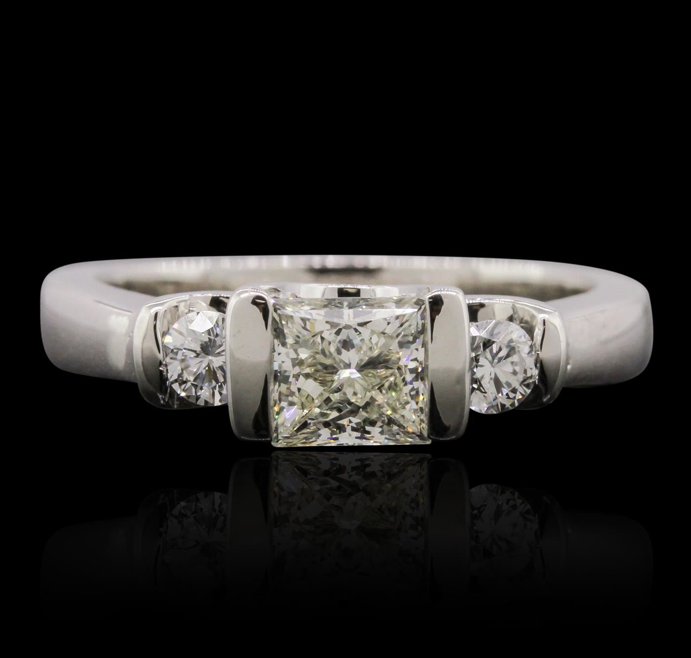 One electronically tested 14KT white gold Ladies combination cast & assembled engagement ring with a bright polish finish. Identified with markings of "14K". Condition is new. Containing: One tension set princess cut diamond, measuring 5.10 x 4.80 x 3.01mm (depth est.) approximate weight of 0.60ct. Clarity: VS-2. Color: K, Cut is Good. Two tension set round brilliant cut diamonds, measuring 3.00 - 3.00 x 1.80mm (depth est.) approximate. Total Weight of 2 Stones = 0.20ct. Clarity: VS-2. Color: G - H, Cut is Very Good. Total Weight of Diamonds 0.80ct. Total Weight of Ring 5.30 grams. GGL Appraised at $5,370.00.