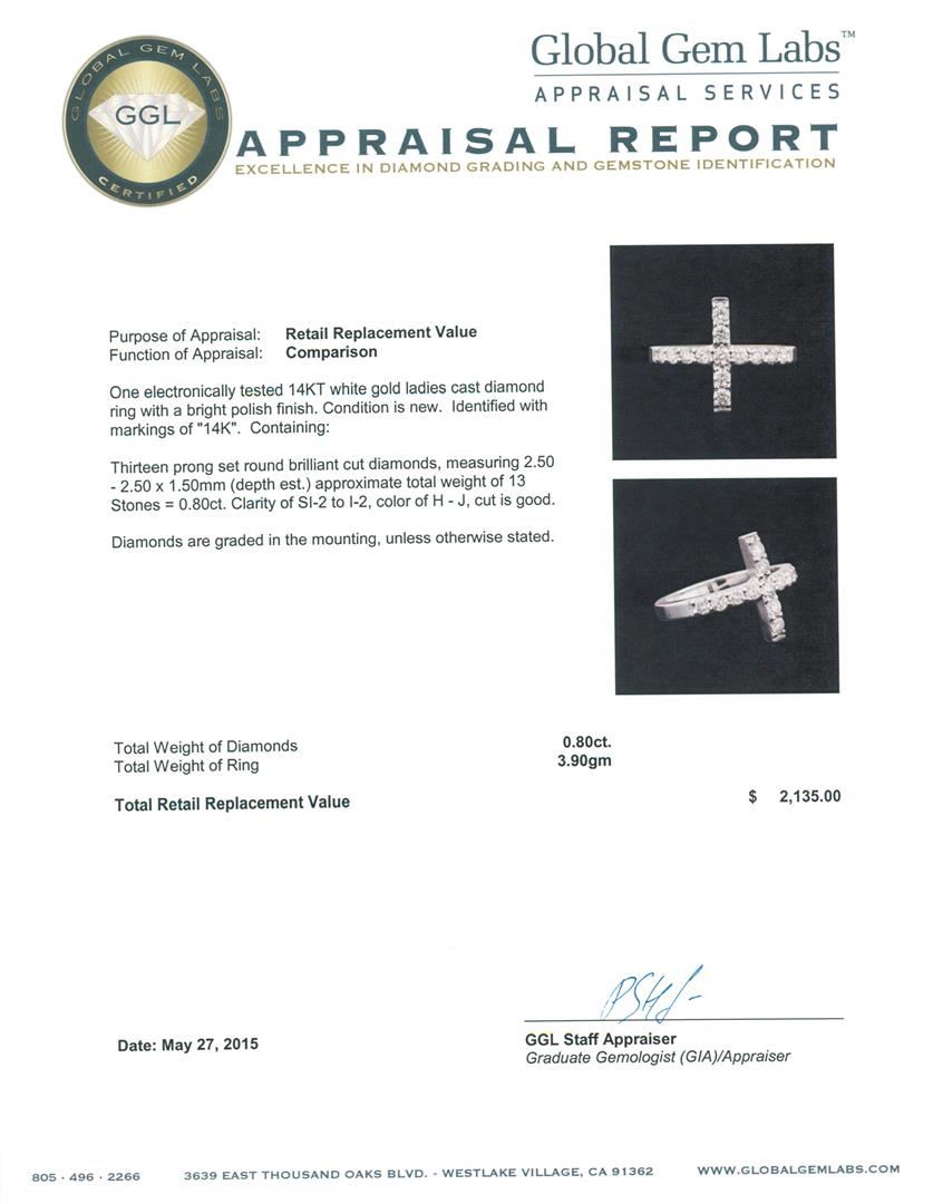 One electronically tested 14KT white gold ladies cast diamond ring with a bright polish finish. Identified with markings of "14K". Condition is new. Containing: Thirteen prong set round brilliant cut diamonds, measuring 2.50 - 2.50 x 1.50mm (depth est.) approximate total weight of 13 Stones = 0.80ct. Clarity: SI-2 to I-2. Color: H - J, Cut is Good. Diamonds are graded in the mounting, unless otherwise stated. Total Weight of Diamonds 0.80ct. Total Weight of Ring 3.90 grams. GGL Appraised at $2,135.00.