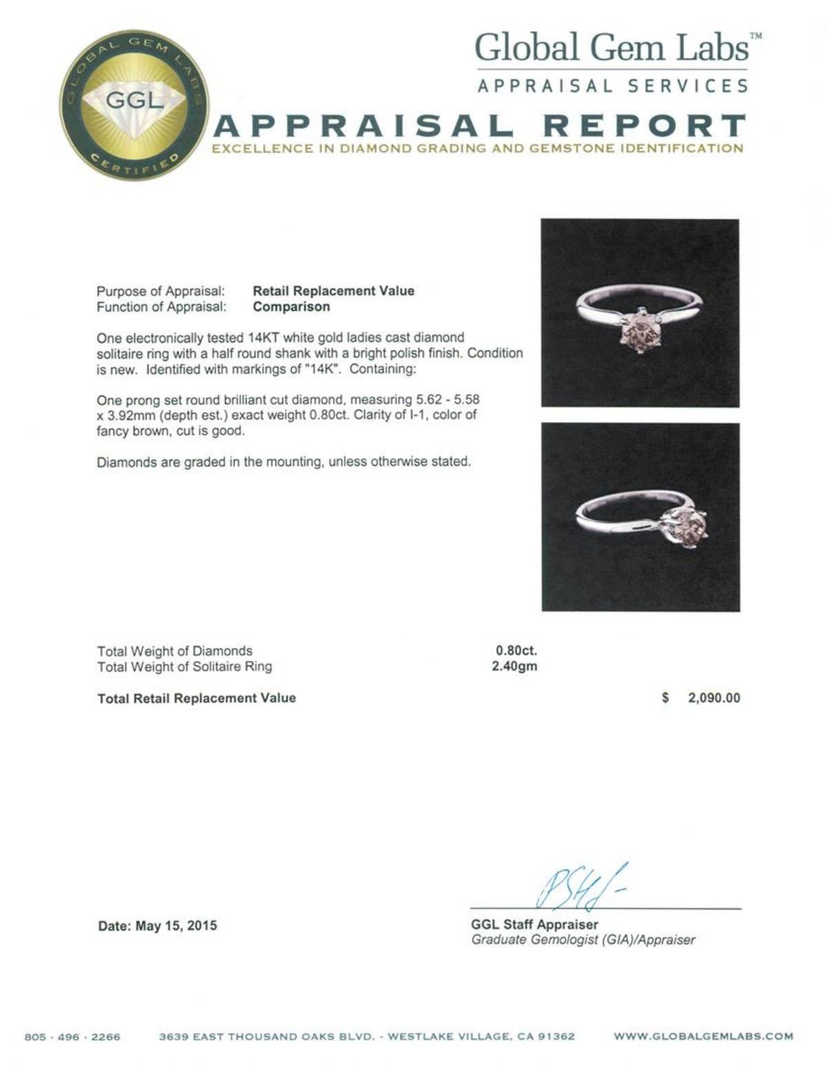 One electronically tested 14KT white gold ladies cast diamond solitaire ring with a half round shank with a bright polish finish. Identified with markings of "14K". Condition is new. Containing: One prong set round brilliant cut diamond, measuring 5.62 - 5.58 x 3.92mm (depth est.) exact weight 0.80ct. Clarity: I-1, Cut is Good. Diamonds are graded in the mounting, unless otherwise stated. Total Weight of Diamonds 0.80ct. Total Weight of Solitaire Ring 2.40 grams. GGL Appraised.