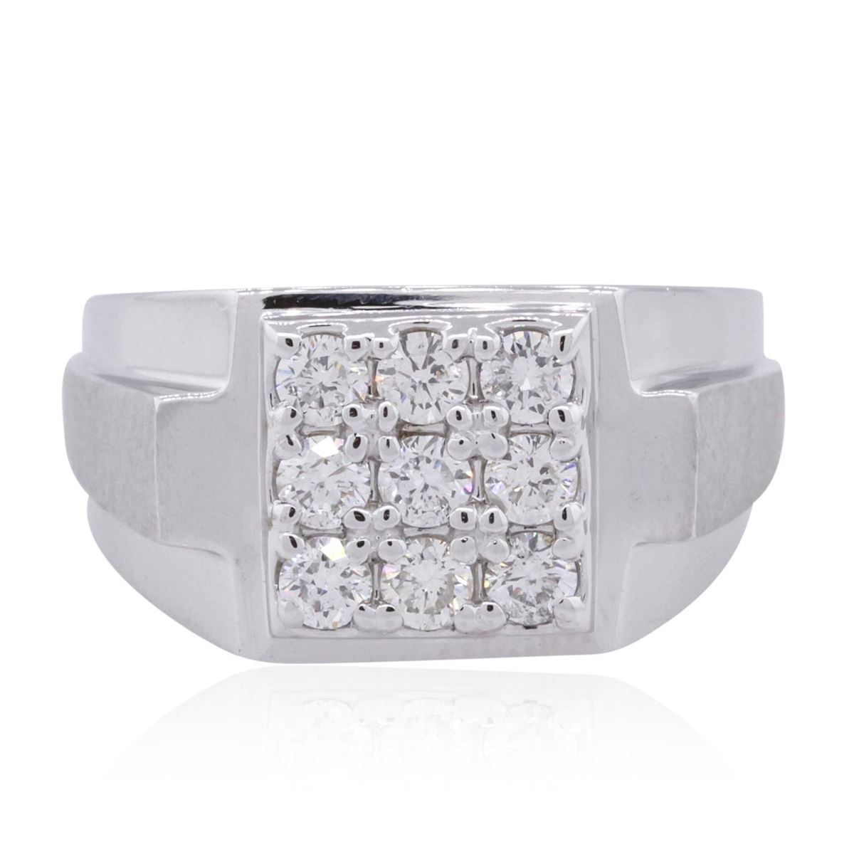 One electronically tested 14KT white gold men's combination cast & assembled diamond ring with a bright polish finish. Identified with markings of "14K". Condition is new. Containing: Nine prong set round brilliant cut diamonds, measuring 2.90 - 2.90 x 1.74mm (depth est.) approximate total weight of 9 Stones = 0.80ct. Clarity: SI-1 to SI-2. Color: I - J, Cut is Good. All diamonds are graded in the mounting, unless otherwise stated. Total Weight of Diamonds 0.80ct. Total Weight of Ring 12.80 grams. GGL Appraised at $5,425.00.