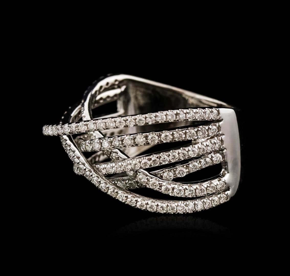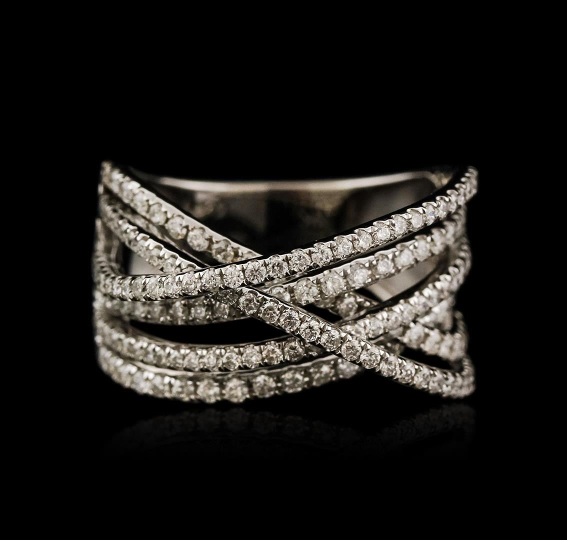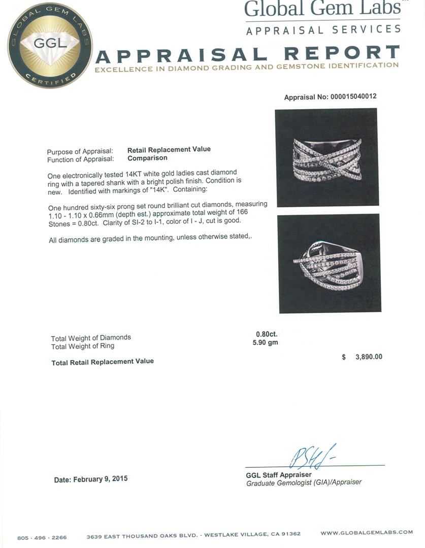 One electronically tested 14KT white gold ladies cast diamond ring with a tapered shank with a bright polish finish. Identified with markings of "14K". Condition is new. Containing: One Hundred Sixty-Six prong set round brilliant cut diamonds, measuring 1.10 - 1.10 x 0.66mm (depth est.) approximate total weight of 166 Stones = 0.80ct. Clarity: SI-2 to I-1. Color: I - J, Cut is Good. All diamonds are graded in the mounting, unless otherwise stated,. Total Weight of Diamonds 0.80ct. Total Weight of Ring 5.90 grams. GGL Appraised at $3,890.00.
