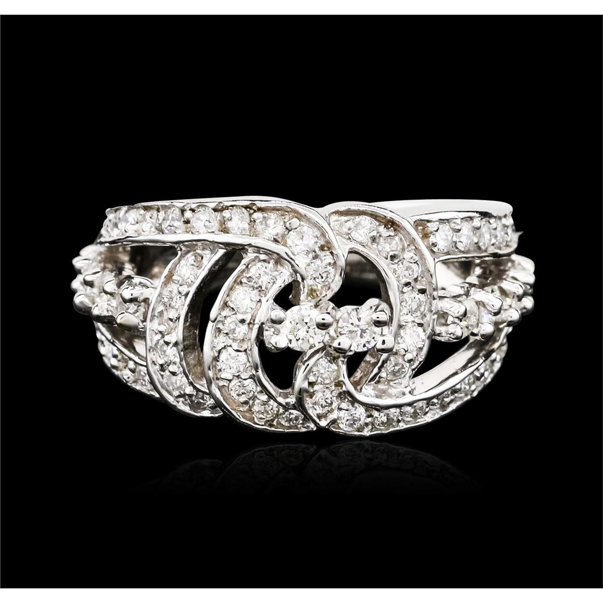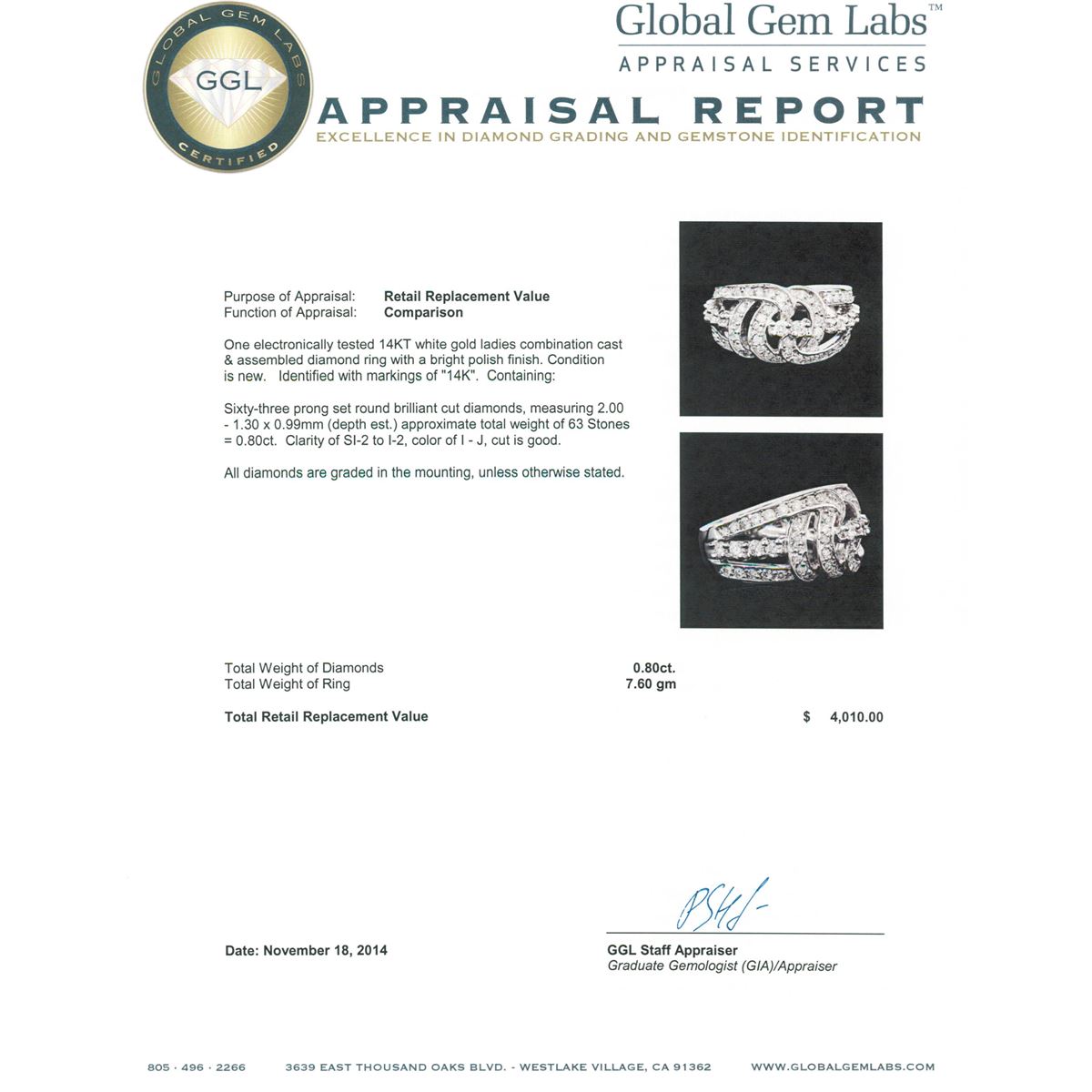 One electronically tested 14KT white gold ladies combination cast & assembled diamond ring with a bright polish finish. Identified with markings of "14K". Condition is new. Containing: Sixty-Three prong set round brilliant cut diamonds, measuring 2.00 - 1.30 x 0.99mm (depth est.) approximate total weight of 63 Stones = 0.80ct. Clarity: SI-2 to I-2. Color: I - J, Cut is Good. All diamonds are graded in the mounting, unless otherwise stated. Total Weight of Diamonds 0.80ct. Total Weight of Ring 7.60 grams. GGL Appraised at $4,010.00.