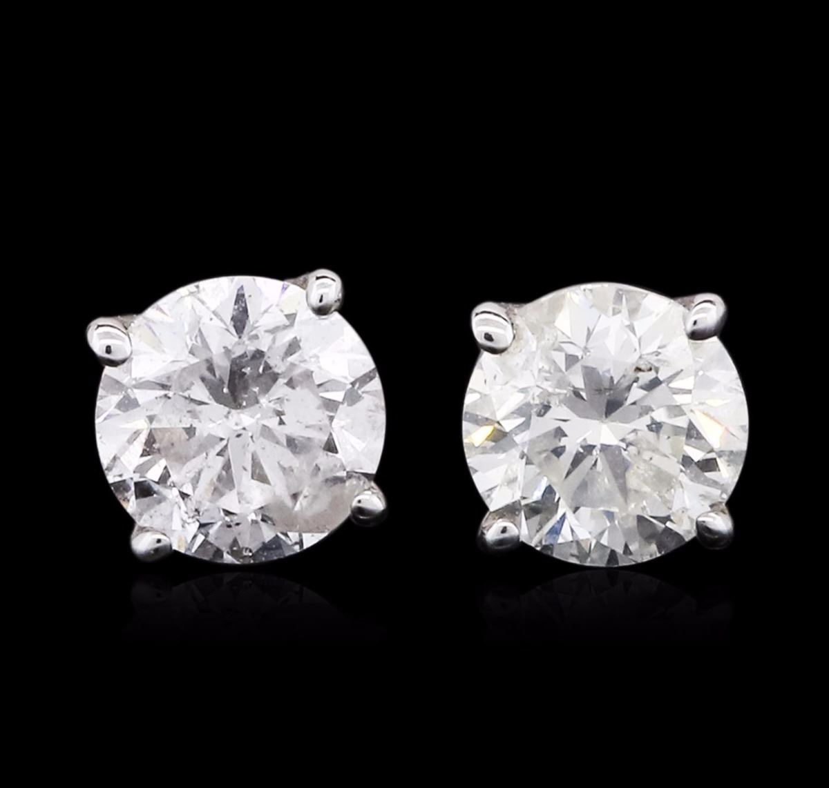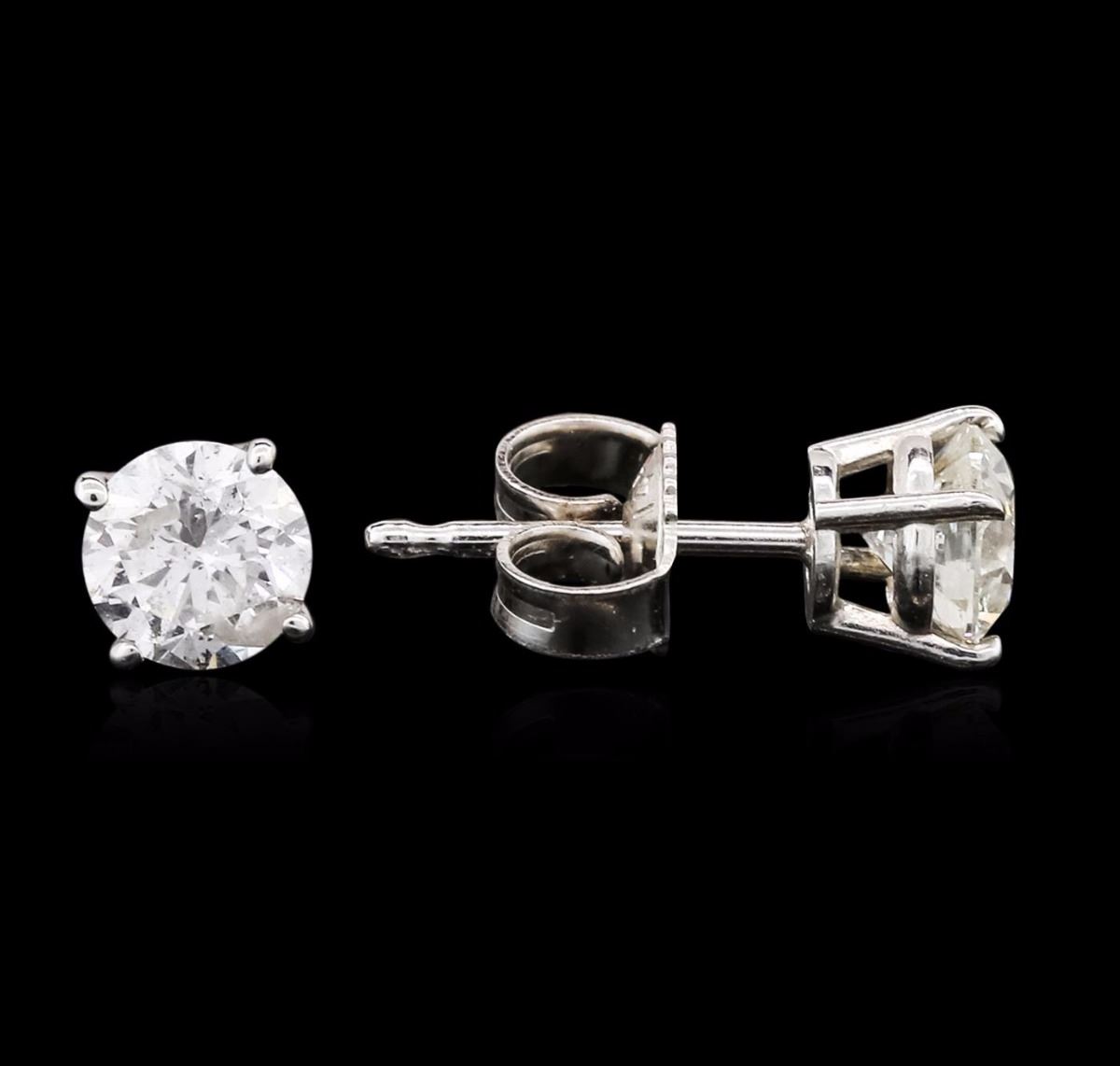 One pair electronically tested 14KT white gold ladies cast diamond stud earrings with friction posts with a bright polish finish. Identified with markings of "14K". Condition is new. Containing: One prong set round brilliant cut diamond, measuring 4.80 - 4.80 x 2.88mm (depth est.) approximate weight of 0.41ct. Clarity: I-1. Color: J, Cut is Good. One prong set round brilliant cut diamond, measuring 4.80 - 4.80 x 2.88mm (depth est.) approximate weight of 0.41ct. Clarity: I-1. Color: J, Cut is Good. All diamonds are graded in the mounting, unless otherwise stated. Total Weight of Diamonds 0.81ct. Total Weight of Earrings 1.00 grams. GGL Appraised at $2,890.00.