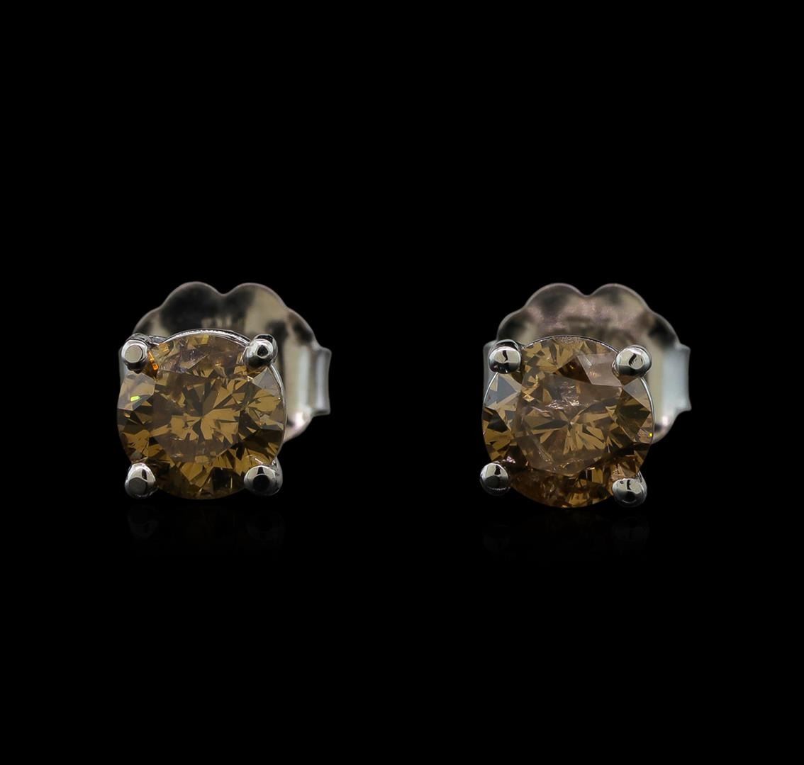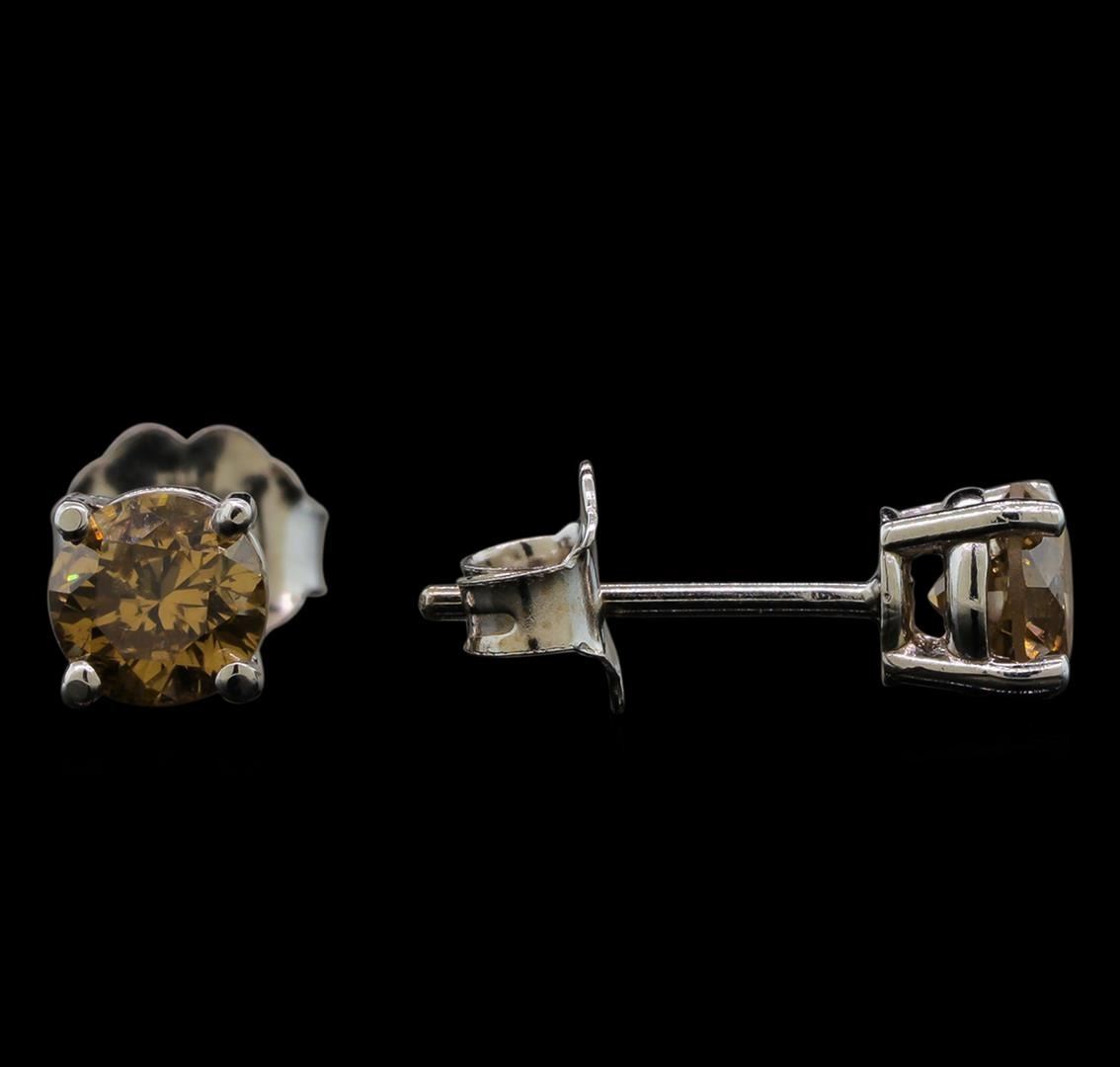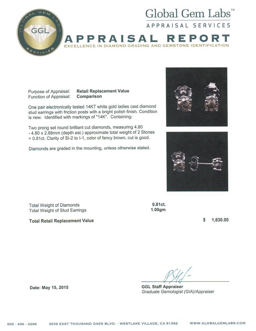 One pair electronically tested 14KT white gold ladies cast diamond stud earrings with friction posts with a bright polish finish. Identified with markings of "14K". Condition is new. Containing: Two prong set round brilliant cut diamonds, measuring 4.80 - 4.80 x 2.88mm (depth est.) approximate total weight of 2 Stones = 0.81ct. Clarity: SI-2 to I-1, Cut is Good. Diamonds are graded in the mounting, unless otherwise stated. Total Weight of Diamonds 0.81ct. Total Weight of Stud Earrings 1.00 grams. GGL Appraised at $1,630.00.