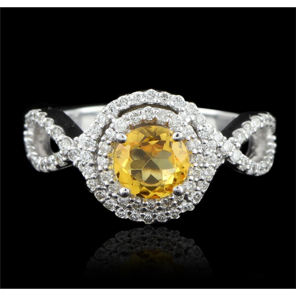 One electronically tested 14KT white gold ladies cast citrine and diamond ring with a bright polish finish. Condition is new, good workmanship. The featured citrine is set within a two tiered diamond bezel, supported by intertwined ribbons of diamonds completed by a two millimeter wide band. Identified with markings of "K14". Containing: One prong set round mixed cut natural citrine quartz, measuring 6.25 - 6.15 x 3.50 mm, approximate weight of 0.81ct., clarity is eye clean, type I, medium, moderately strong, yellow color, (GIA Y 5/4), cut is good. Transmitting light with no distortion, transparent. Graded in the setting. Eighty-eight prong set round brilliant cut diamonds, measuring 1.20 - 1.10 x 0.69mm (depth est.) approximate total weight of 88 Stones = 0.56ct. Graded in the setting. Clarity SI-1 to SI-2. Color F - H. Total Weight of Colored Stones 0.81ct. Total Weight of Diamonds 0.56ct. Total Weight of Ring 4.40gm. AIG Appraised at $3,550.00.