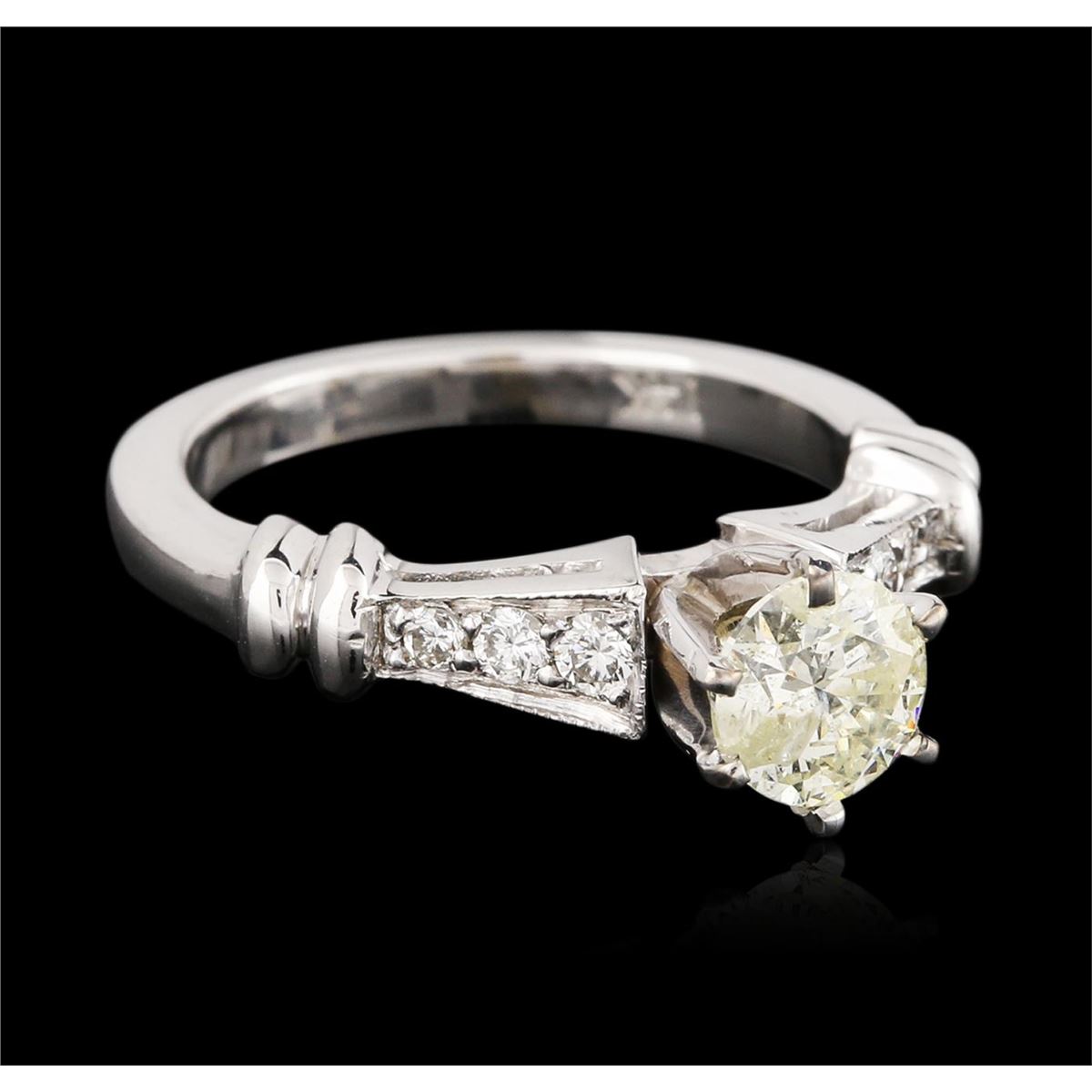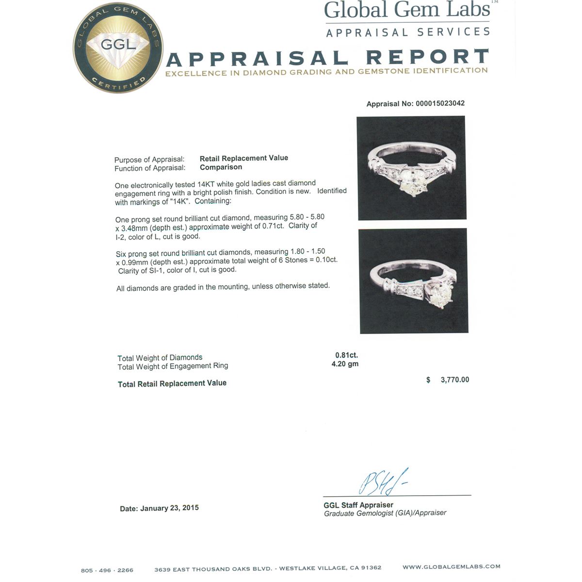 One electronically tested 14KT white gold ladies cast diamond engagement ring with a bright polish finish. Identified with markings of "14K". Condition is new. Containing: One prong set round brilliant cut diamond, measuring 5.80 - 5.80 x 3.48mm (depth est.) approximate weight of 0.71ct. Clarity: I-2. Color: L, Cut is Good. Six prong set round brilliant cut diamonds, measuring 1.80 - 1.50 x 0.99mm (depth est.) approximate total weight of 6 Stones = 0.10ct. Clarity: SI-1. Color: I, Cut is Good. All diamonds are graded in the mounting, unless otherwise stated. Total Weight of Diamonds 0.81ct. Total Weight of Engagement Ring 4.20 grams. GGL Appraised at $3,770.00.