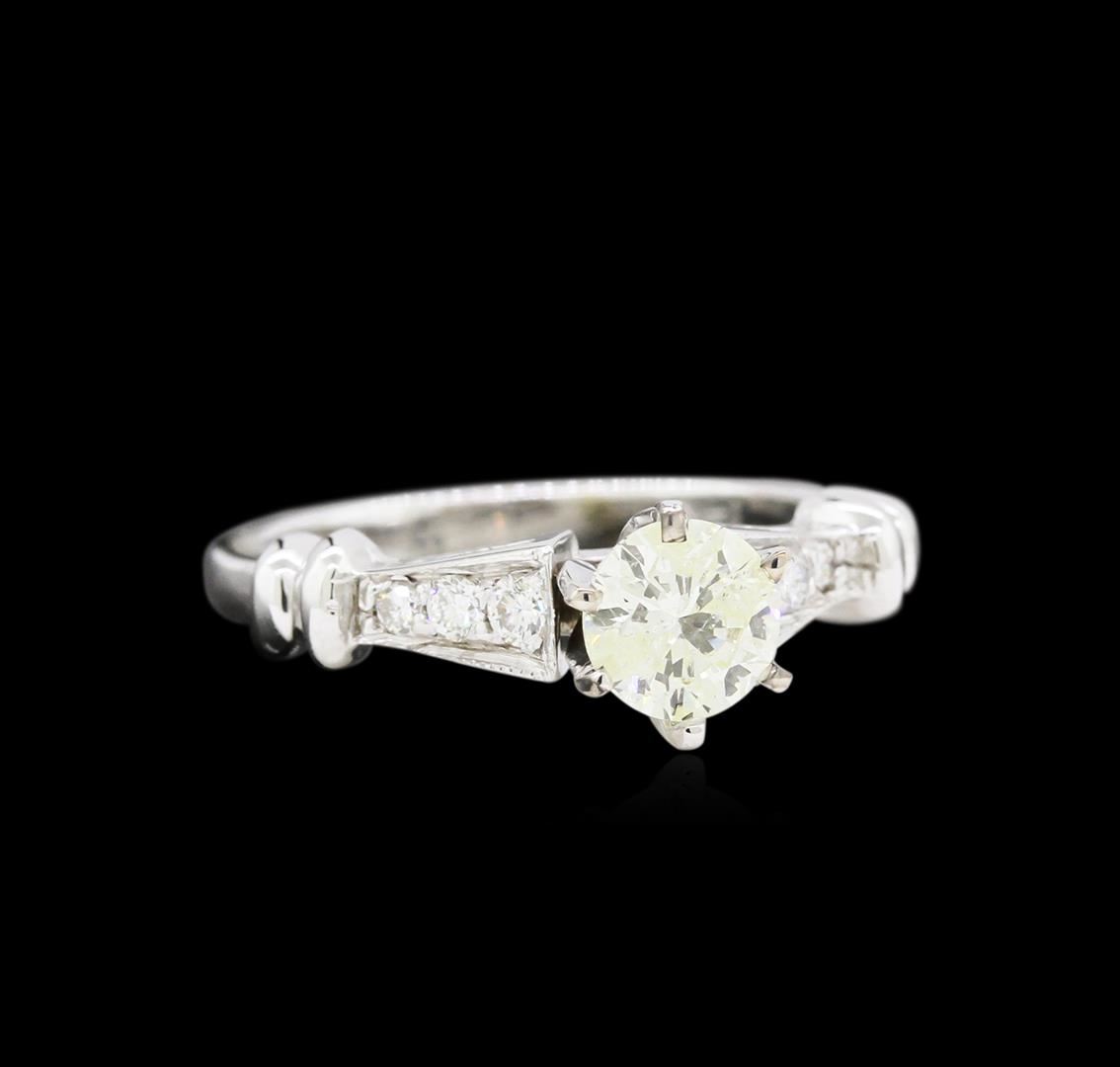 One electronically tested 14KT white gold ladies cast diamond engagement ring with a bright polish finish. Identified with markings of "14K". Condition is new. Containing: One prong set round brilliant cut diamond, measuring 5.80 - 5.80 x 3.48mm (depth est.) approximate weight of 0.71ct. Clarity: I-2. Color: L, Cut is Good. Six prong set round brilliant cut diamonds, measuring 1.80 - 1.50 x 0.99mm (depth est.) approximate total weight of 6 Stones = 0.10ct. Clarity: SI-1. Color: I, Cut is Good. All diamonds are graded in the mounting, unless otherwise stated. Total Weight of Diamonds 0.81ct. Total Weight of Engagement Ring 4.20 grams. GGL Appraised at $3,770.00.