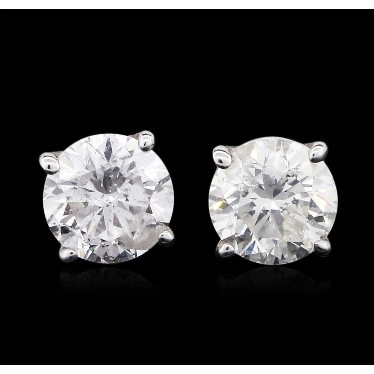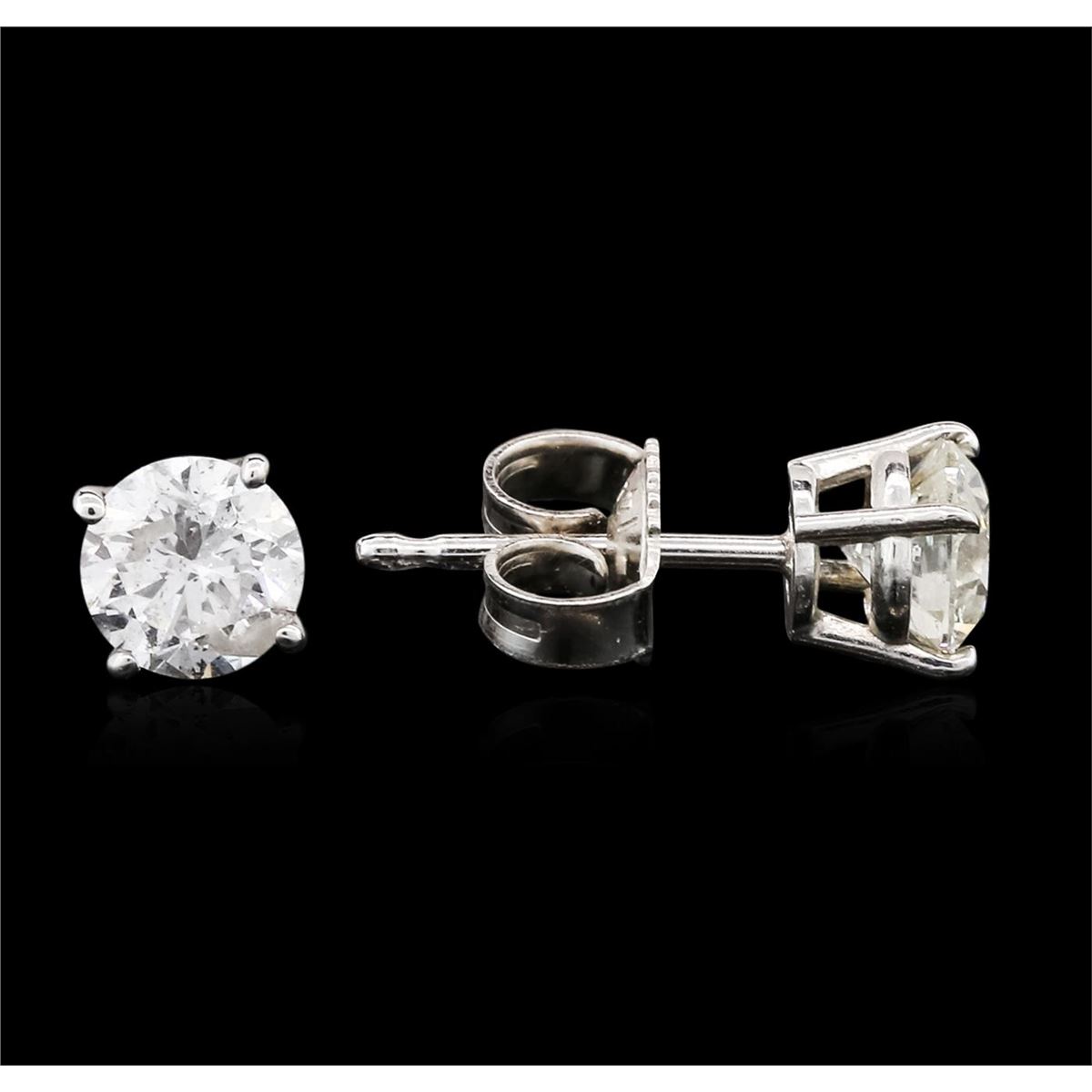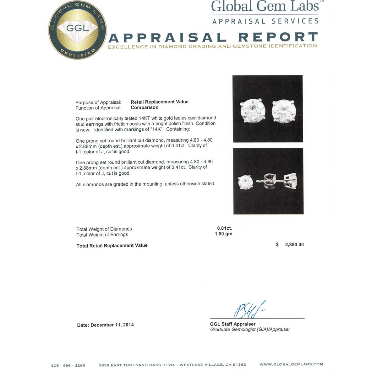 One pair electronically tested 14KT white gold ladies cast diamond stud earrings with friction posts with a bright polish finish. Identified with markings of "14K". Condition is new. Containing: One prong set round brilliant cut diamond, measuring 4.80 - 4.80 x 2.88mm (depth est.) approximate weight of 0.41ct. Clarity: I-1. Color: J, Cut is Good. One prong set round brilliant cut diamond, measuring 4.80 - 4.80 x 2.88mm (depth est.) approximate weight of 0.41ct. Clarity: I-1. Color: J, Cut is Good. All diamonds are graded in the mounting, unless otherwise stated. Total Weight of Diamonds 0.81ct. Total Weight of Earrings 1.00 grams. GGL Appraised at $2,890.00.