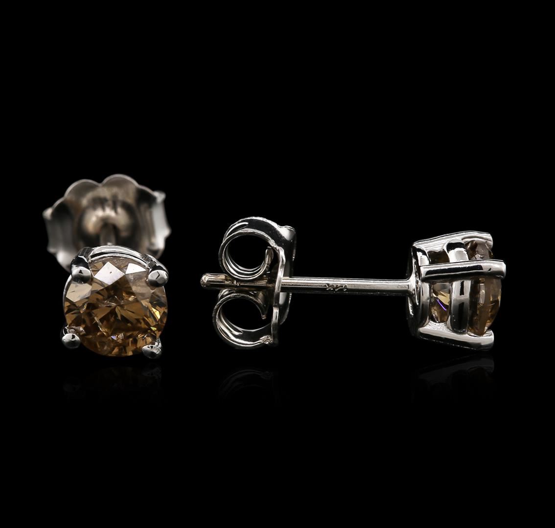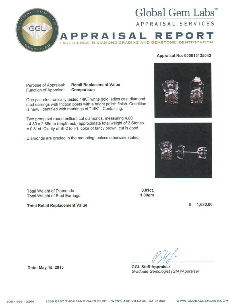 One pair electronically tested 14KT white gold ladies cast diamond stud earrings with friction posts with a bright polish finish. Identified with markings of "14K". Condition is new. Containing: Two prong set round brilliant cut diamonds, measuring 4.80 - 4.80 x 2.88mm (depth est.) approximate total weight of 2 Stones = 0.81ct. Clarity: SI-2 to I-1, Cut is Good. Diamonds are graded in the mounting, unless otherwise stated. Total Weight of Diamonds 0.81ct. Total Weight of Stud Earrings 1.00 grams. GGL Appraised at $1,630.00.
