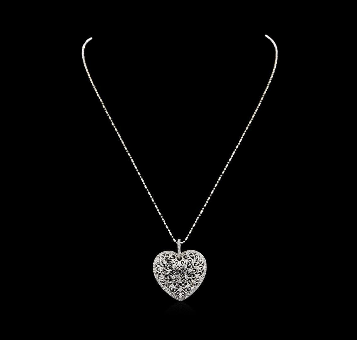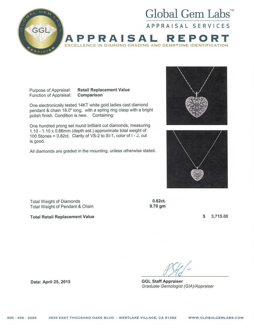 One electronically tested 14KT white gold ladies cast diamond pendant & chain 18.0" long, with a spring ring clasp with a bright polish finish. Condition is new. Containing: One Hundred prong set round brilliant cut diamonds, measuring 1.10 - 1.10 x 0.66mm (depth est.) approximate total weight of 100 Stones = 0.82ct. Clarity: VS-2 to SI-1. Color: I - J, Cut is Good. All diamonds are graded in the mounting, unless otherwise stated. Total Weight of Diamonds 0.82ct. Total Weight of Pendant & Chain 9.70 grams. GGL Appraised.