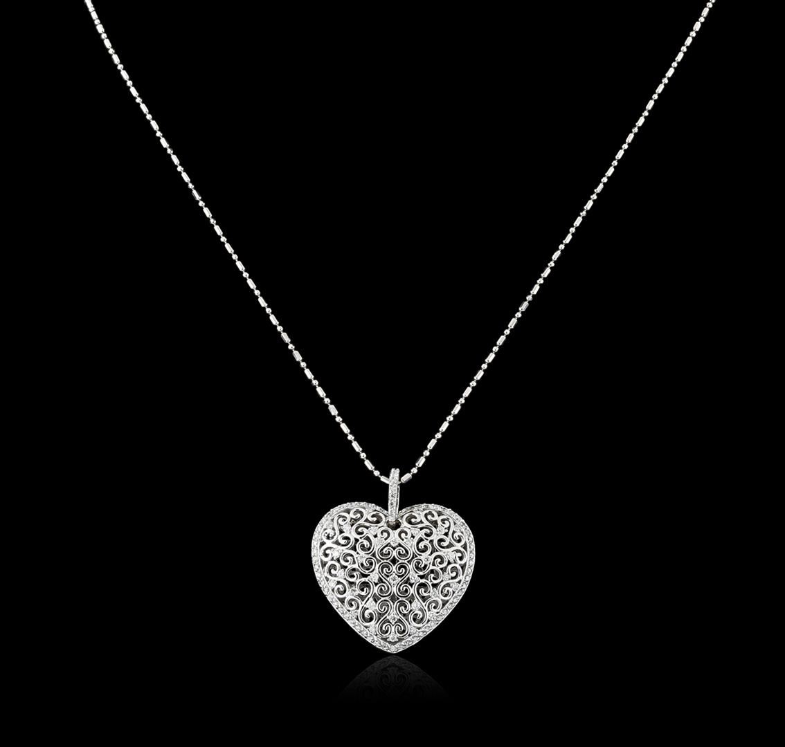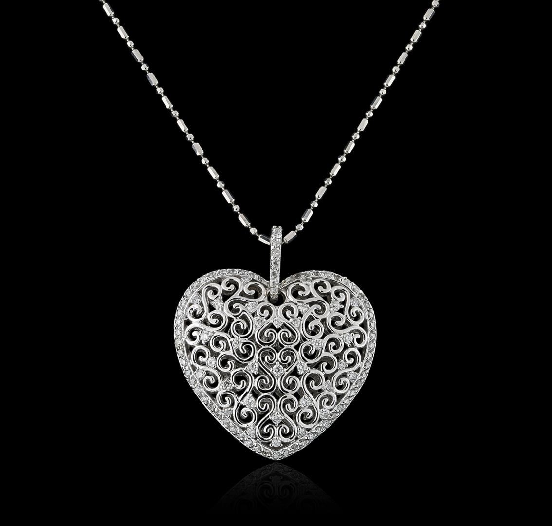 One electronically tested 14KT white gold ladies cast diamond pendant & chain 18.0" long, with a spring ring clasp with a bright polish finish. Condition is new. Containing: One Hundred prong set round brilliant cut diamonds, measuring 1.10 - 1.10 x 0.66mm (depth est.) approximate total weight of 100 Stones = 0.82ct. Clarity: VS-2 to SI-1. Color: I - J, Cut is Good. All diamonds are graded in the mounting, unless otherwise stated. Total Weight of Diamonds 0.82ct. Total Weight of Pendant & Chain 9.70 grams. GGL Appraised at $3,715.00.