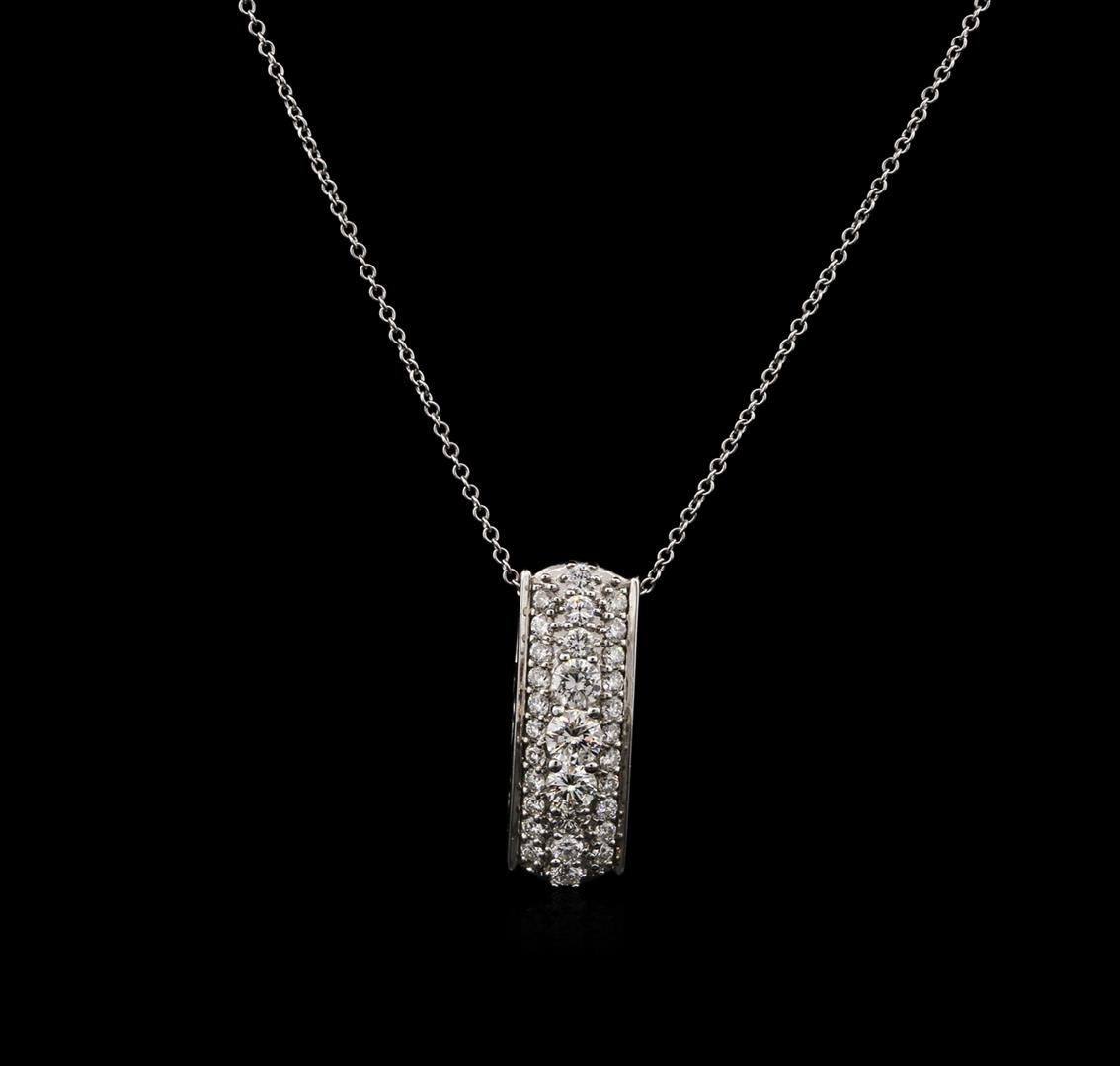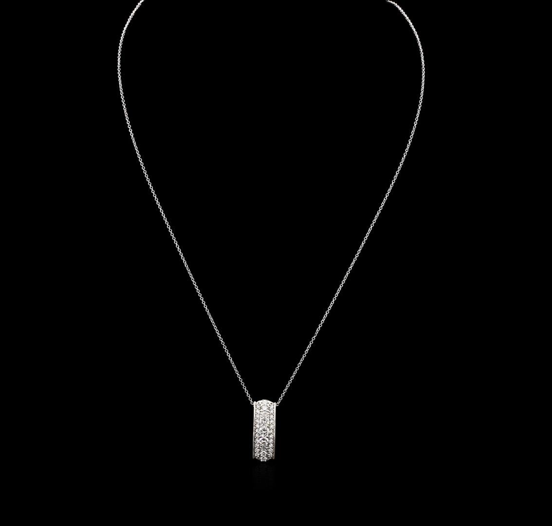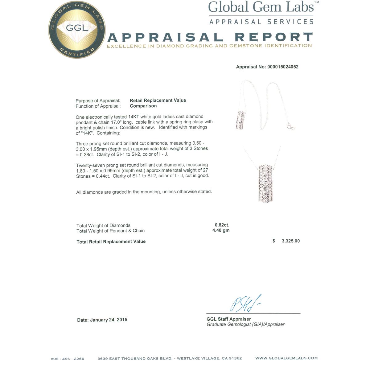 One electronically tested 14KT white gold ladies cast diamond pendant & chain 17.0" long, cable link with a spring ring clasp with a bright polish finish. Identified with markings of "14K". Condition is new. Containing: Three prong set round brilliant cut diamonds, measuring 3.50 - 3.00. x 1.95mm (depth est.) approximate total weight of 3 Stones = 0.38ct. Clarity: SI-1 to SI-2. Color: I - J. Twenty-Seven prong set round brilliant cut diamonds, measuring 1.80 - 1.50 x 0.99mm (depth est.) approximate total weight of 27 Stones = 0.44ct. Clarity: SI-1 to SI-2. Color: I - J, Cut is Good. All diamonds are graded in the mounting, unless otherwise stated. Total Weight of Diamonds 0.82ct. Total Weight of Pendant & Chain 4.40 grams. GGL Appraised at $3,325.00.