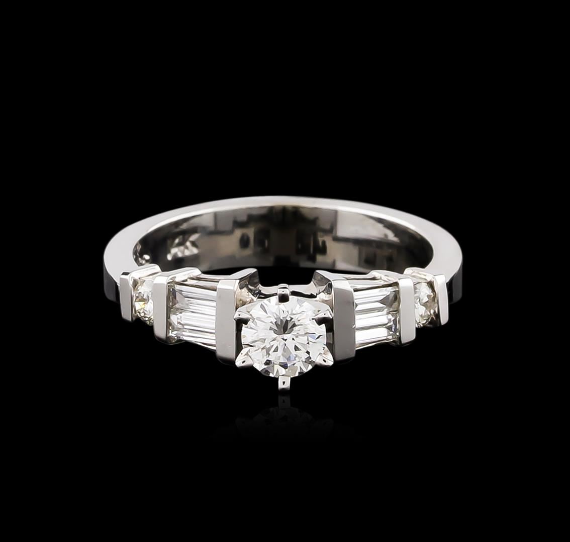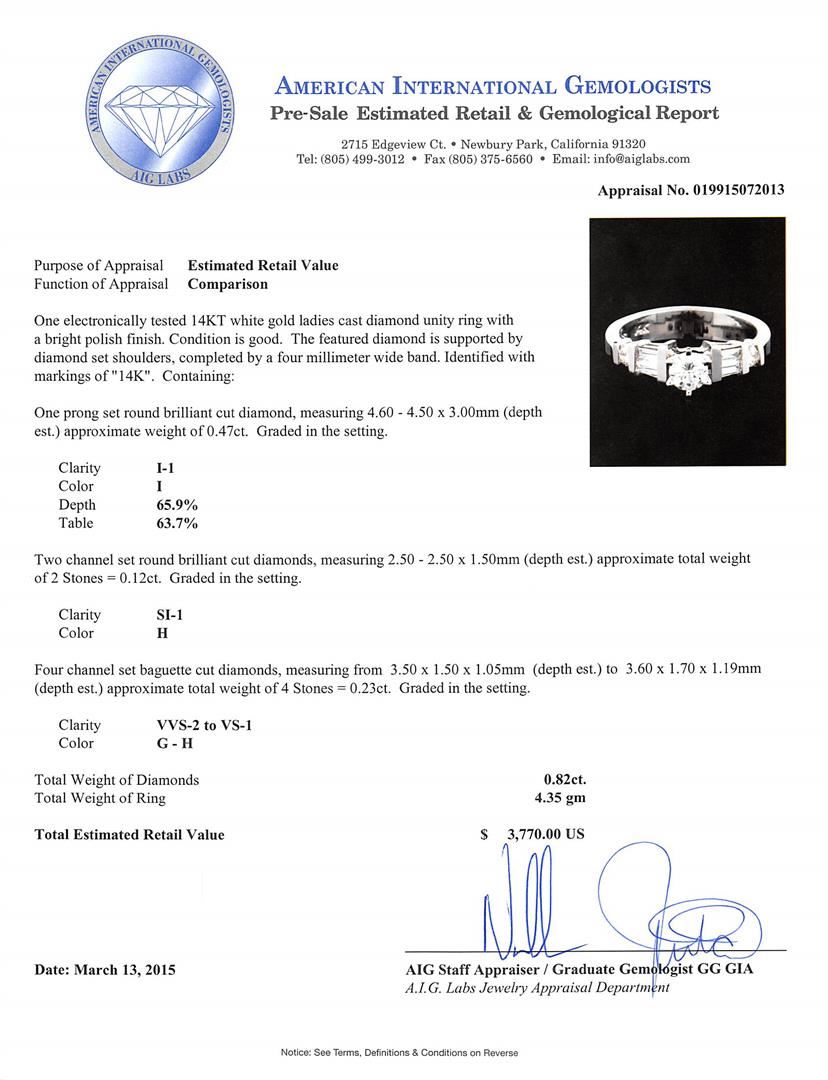 One electronically tested 14KT white gold ladies cast diamond unity ring with a bright polish finish. The featured diamond is supported by diamond set shoulders, completed by a four millimeter wide band. Identified with markings of "14K". Condition is good. Containing: One prong set round brilliant cut diamond, measuring 4.60 - 4.50 x 3.00mm (depth est.) approximate weight of 0.47ct. Graded in the setting. Clarity: I-1. Color: I. Depth 65.9%. Table 63.7%. Two channel set round brilliant cut diamonds, measuring 2.50 - 2.50 x 1.50mm (depth est.) approximate total weight of 2 Stones = 0.12ct. Graded in the setting. Clarity: SI-1. Color: H Four channel set baguette cut diamonds, measuring from 3.50 x 1.50 x 1.05mm (depth est.) to 3.60 x 1.70 x 1.19mm (depth est.) approximate total weight of 4 Stones = 0.23ct. Graded in the setting. Clarity: VVS-2 to VS-1. Color: G - H. Total Weight of Diamonds 0.82ct. Total Weight of Ring 4.35 grams. AIG Appraised at $3,770.00.