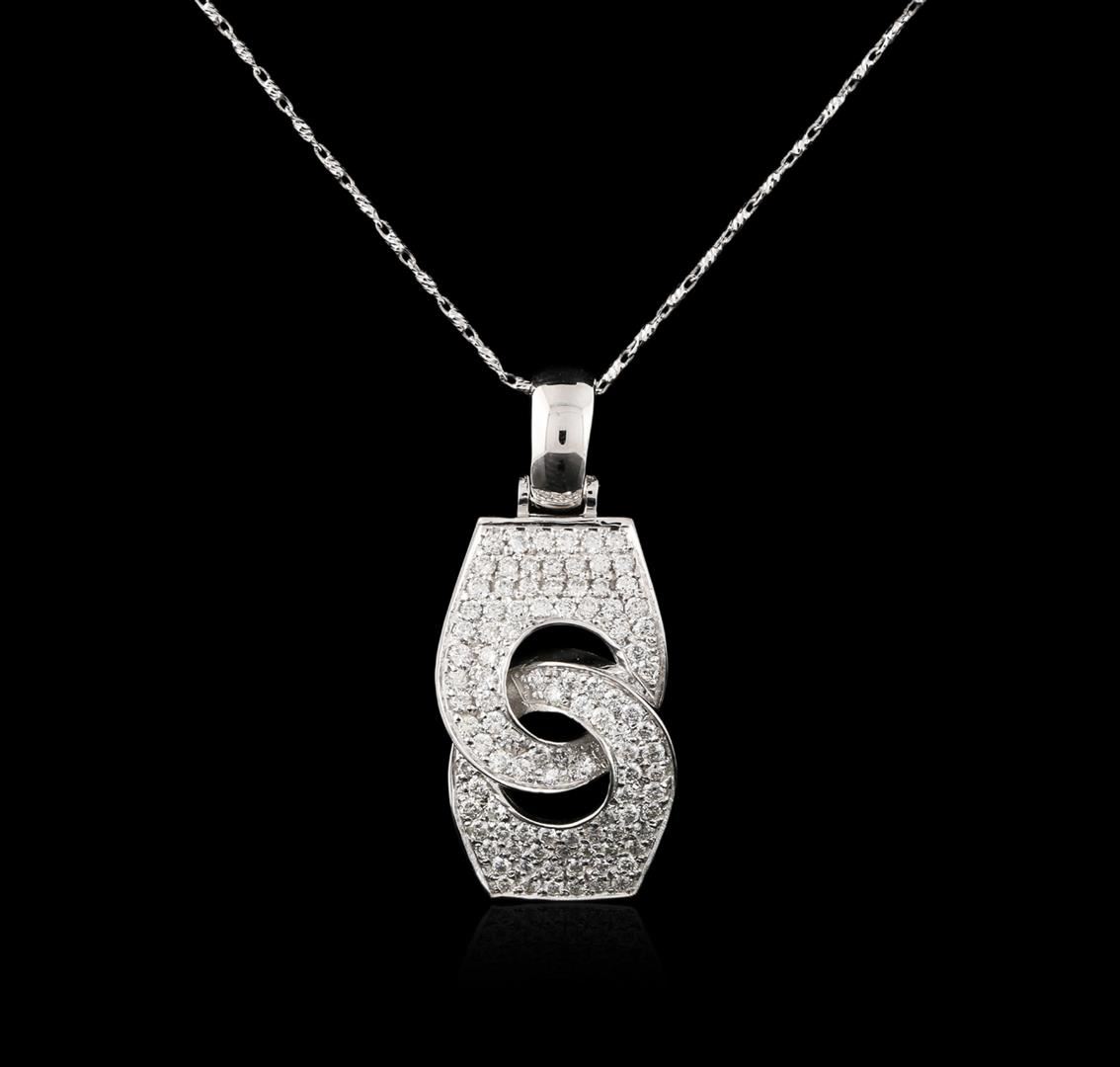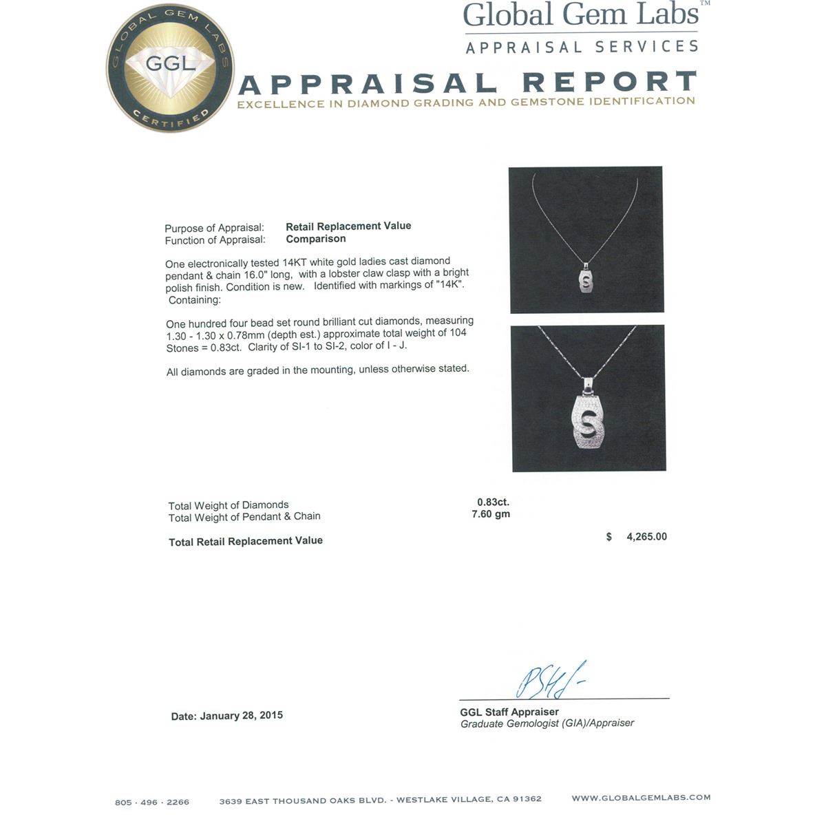 One electronically tested 14KT white gold ladies cast diamond pendant & chain 16.0" long, with a lobster claw clasp with a bright polish finish. Identified with markings of "14K". Condition is new. Containing: One Hundred Four bead set round brilliant cut diamonds, measuring 1.30 - 1.30 x 0.78mm (depth est.) approximate total weight of 104 Stones = 0.83ct. Clarity: SI-1 to SI-2. Color: I - J. All diamonds are graded in the mounting, unless otherwise stated. Total Weight of Diamonds 0.83ct. Total Weight of Pendant & Chain 7.60 grams. GGL Appraised at $4,265.00.