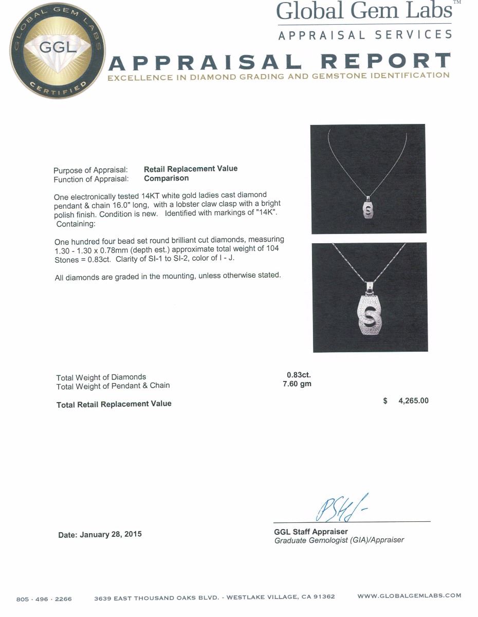 One electronically tested 14KT white gold ladies cast diamond pendant & chain 16.0" long, with a lobster claw clasp with a bright polish finish. Identified with markings of "14K". Condition is new. Containing: One Hundred Four bead set round brilliant cut diamonds, measuring 1.30 - 1.30 x 0.78mm (depth est.) approximate total weight of 104 Stones = 0.83ct. Clarity: SI-1 to SI-2. Color: I - J. All diamonds are graded in the mounting, unless otherwise stated. Total Weight of Diamonds 0.83ct. Total Weight of Pendant & Chain 7.60 grams. GGL Appraised at $4,265.00.