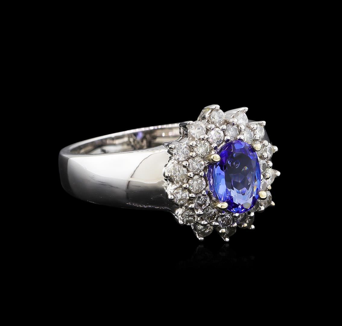 One electronically tested 14KT white gold Ladies combination cast & assembled ring with a bright polish finish. Condition is new. Identified with markings of "14K". Containing: One prong set oval modified brilliant cut natural tanzanite, measuring 7.00 x 5.00 x 3.25mm, approximate weight of 0.83ct., clarity is eye clean, type I, medium, very slightly grayish, violet color, (GIA V 5/3), cut is very good. Colored gemstones are presumed to have been subjected to commonly used color/clarity enhancement processes. Twenty-Eight prong set round brilliant cut diamonds, measuring 2.00 - 2.00 x 1.20mm (depth est.) approximate. Total Weight of 28 Stones = 0.57ct. Clarity: I-1 to I-2. Color: I - J, Cut is Good. Total Weight of Colored Stones 0.83ct. Total Weight of Diamonds 0.57ct. Total Weight of Ring 6.40 grams. GGL Appraised at $4,715.00.