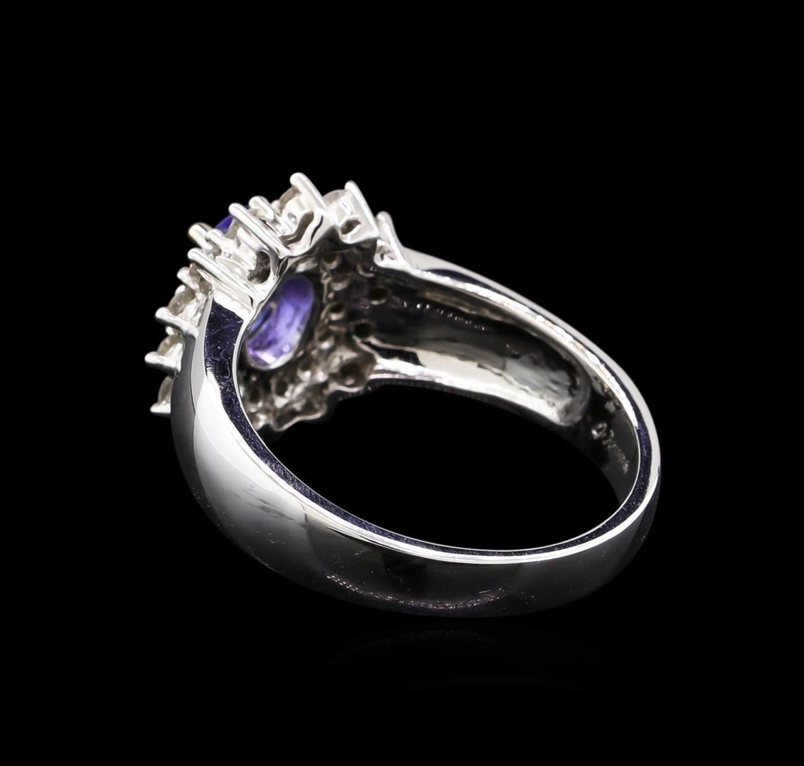One electronically tested 14KT white gold Ladies combination cast & assembled ring with a bright polish finish. Condition is new. Identified with markings of "14K". Containing: One prong set oval modified brilliant cut natural tanzanite, measuring 7.00 x 5.00 x 3.25mm, approximate weight of 0.83ct., clarity is eye clean, type I, medium, very slightly grayish, violet color, (GIA V 5/3), cut is very good. Colored gemstones are presumed to have been subjected to commonly used color/clarity enhancement processes. Twenty-Eight prong set round brilliant cut diamonds, measuring 2.00 - 2.00 x 1.20mm (depth est.) approximate. Total Weight of 28 Stones = 0.57ct. Clarity: I-1 to I-2. Color: I - J, Cut is Good. Total Weight of Colored Stones 0.83ct. Total Weight of Diamonds 0.57ct. Total Weight of Ring 6.40 grams. GGL Appraised.