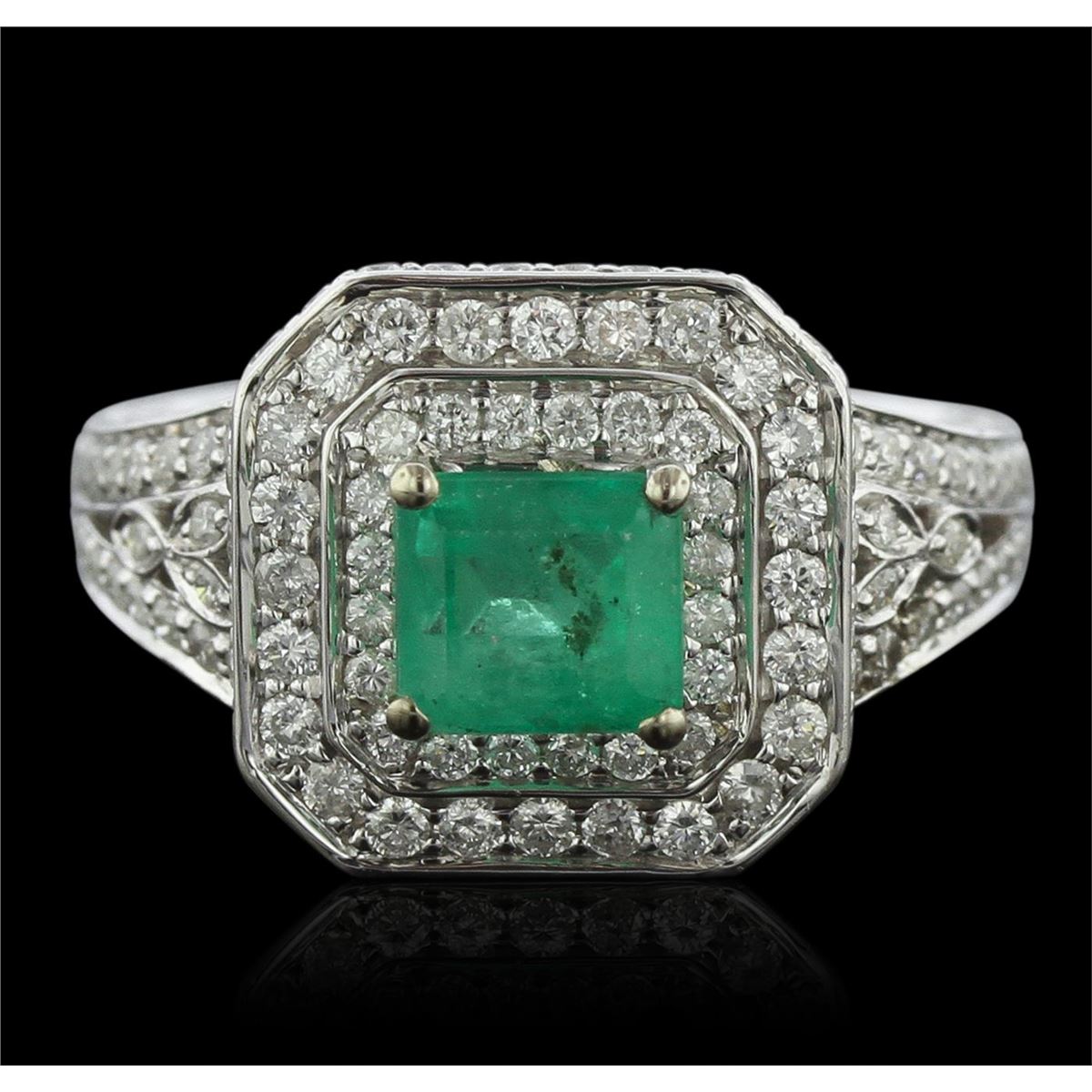 One electronically tested 14KT white gold Ladies combination cast & assembled ring with a bright polish finish. Condition is new. Identified with markings of "14K". Containing: One prong set emerald standard step cut natural emerald, measuring 6.26 x 5.28 x 3.43mm, approximate weight of 0.83ct., clarity is moderately included, type III, medium, moderately strong, green color, (GIA G 5/4), cut is good. Colored gemstones are presumed to have been subjected to commonly used color/clarity enhancement processes. One Hundred Forty prong set round brilliant cut diamonds, measuring 1.40 - 1.10 x 0.75mm (depth est.) approximate. Total Weight of 140 Stones = 0.99ct. . Clarity: I-1 to I-2. Color: H - I, Cut is Good. Total Weight of Colored Stones 0.83ct. Total Weight of Diamonds 0.99ct. Total Weight of Ring 7.00 grams. GGL Appraised at $6,285.00.
