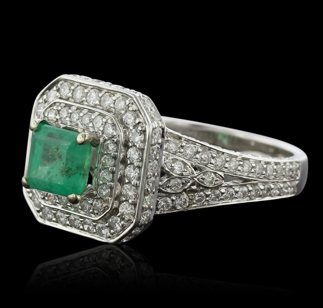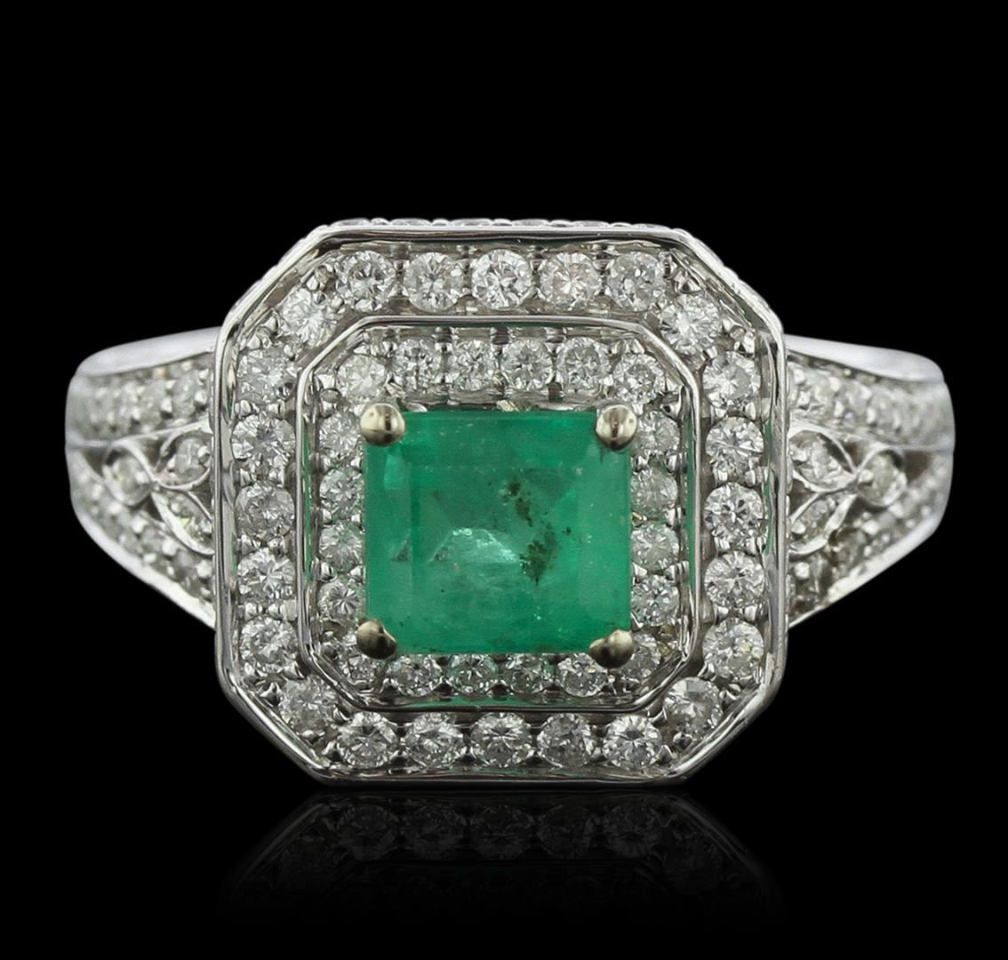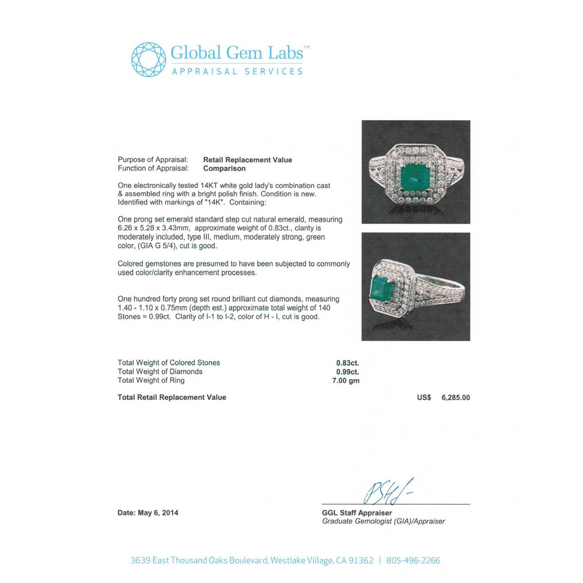 One electronically tested 14KT white gold Ladies combination cast & assembled ring with a bright polish finish. Condition is new. Identified with markings of "14K". Containing: One prong set emerald standard step cut natural emerald, measuring 6.26 x 5.28 x 3.43mm, approximate weight of 0.83ct., clarity is moderately included, type III, medium, moderately strong, green color, (GIA G 5/4), cut is good. Colored gemstones are presumed to have been subjected to commonly used color/clarity enhancement processes. One Hundred Forty prong set round brilliant cut diamonds, measuring 1.40 - 1.10 x 0.75mm (depth est.) approximate. Total Weight of 140 Stones = 0.99ct. . Clarity: I-1 to I-2. Color: H - I, Cut is Good. Total Weight of Colored Stones 0.83ct. Total Weight of Diamonds 0.99ct. Total Weight of Ring 7.00 grams. GGL Appraised at $6,285.00.
