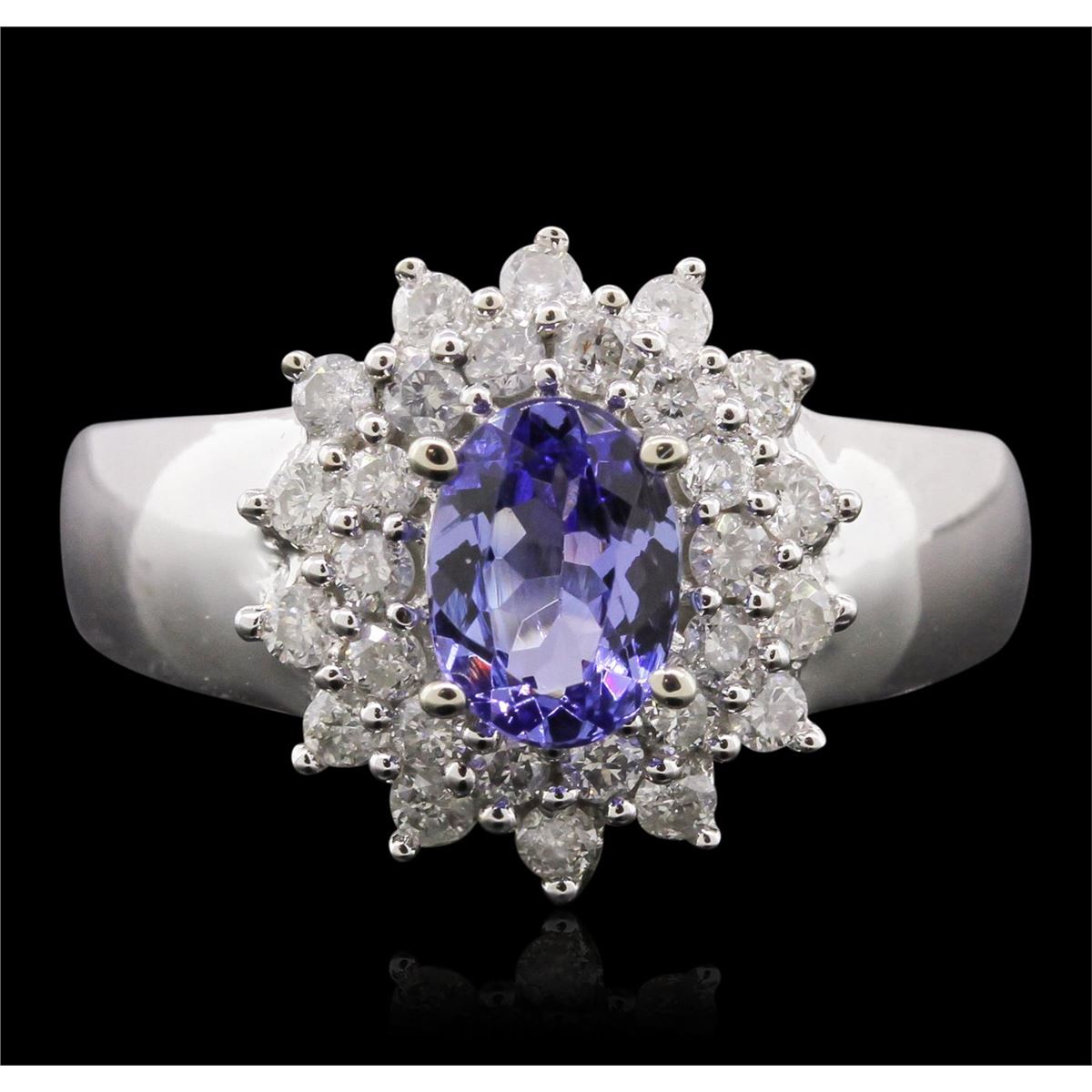 One electronically tested 14KT white gold Ladies combination cast & assembled ring with a bright polish finish. Condition is new. Identified with markings of "14K". Containing: One prong set oval modified brilliant cut natural tanzanite, measuring 7.00 x 5.00 x 3.25mm, approximate weight of 0.83ct., clarity is eye clean, type I, medium, very slightly grayish, violet color, (GIA V 5/3), cut is very good. Colored gemstones are presumed to have been subjected to commonly used color/clarity enhancement processes. Twenty-Eight prong set round brilliant cut diamonds, measuring 2.00 - 2.00 x 1.20mm (depth est.) approximate. Total Weight of 28 Stones = 0.57ct. Clarity: I-1 to I-2. Color: I - J, Cut is Good. Total Weight of Colored Stones 0.83ct. Total Weight of Diamonds 0.57ct. Total Weight of Ring 6.40 grams. GGL Appraised at $4,715.00.
