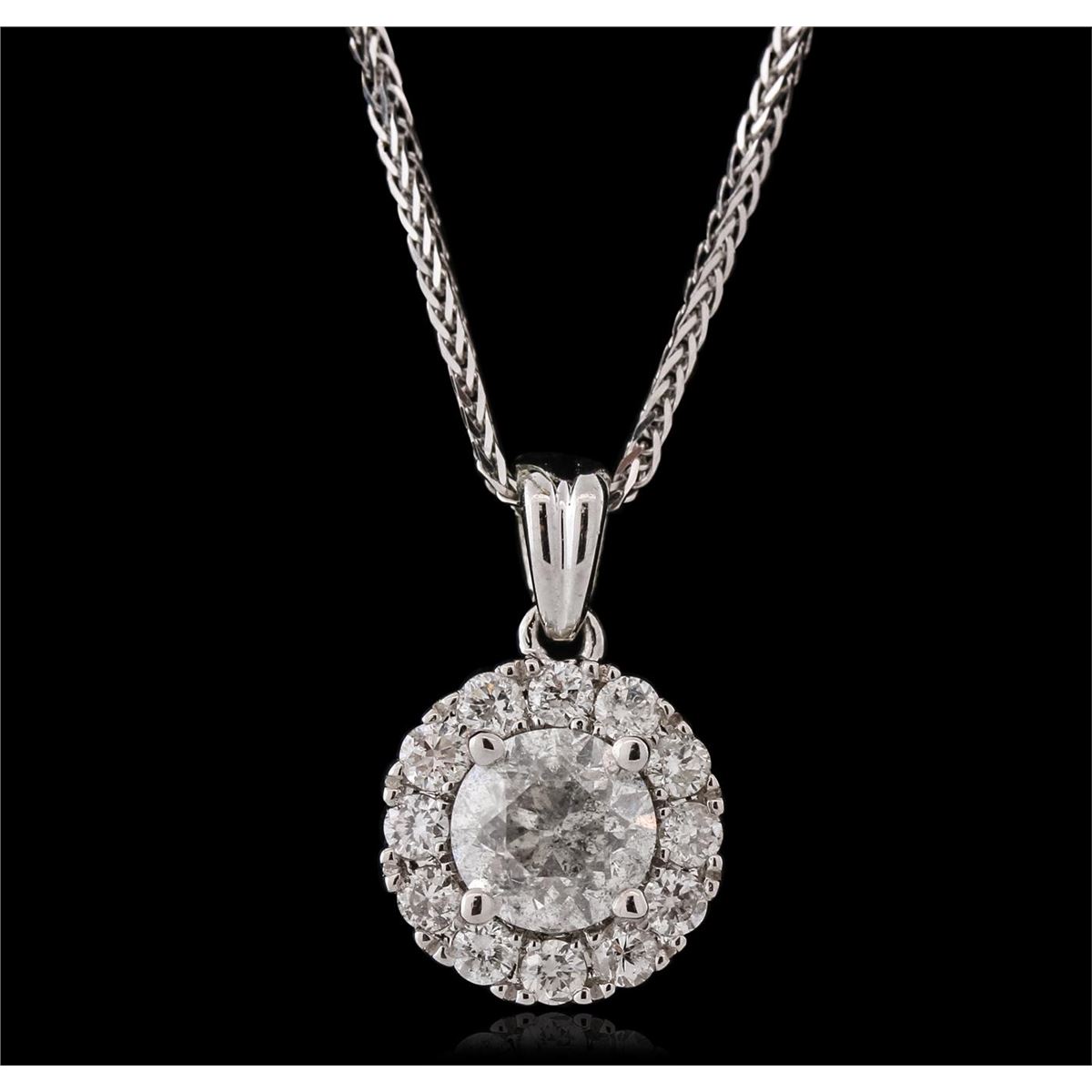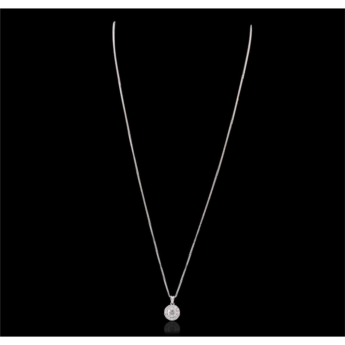 One electronically tested 14KT white gold ladies combination cast & assembled diamond pendant & chain 18.0" long, medium fancy cable with a lobster claw clasp with a bright polish finish. Identified with markings of "14K". Condition is new. Containing: One prong set round brilliant cut diamond, measuring 5.42 - 5.38 x 3.24mm (depth est.) approximate weight of 0.58ct. Clarity: I-2. Color: H, Cut is Good. Twelve prong set round brilliant cut diamonds, measuring 1.80 - 1.80 x 1.08mm (depth est.) approximate total weight of 12 Stones = 0.26ct. Clarity: SI-2 to I-2. Color: H - J, Cut is Good. All diamonds are graded in the mounting, unless otherwise stated. Total Weight of Diamonds 0.83ct. Total Weight of Pendant & Chain 2.60 grams. GGL Appraised at $4,570.00.