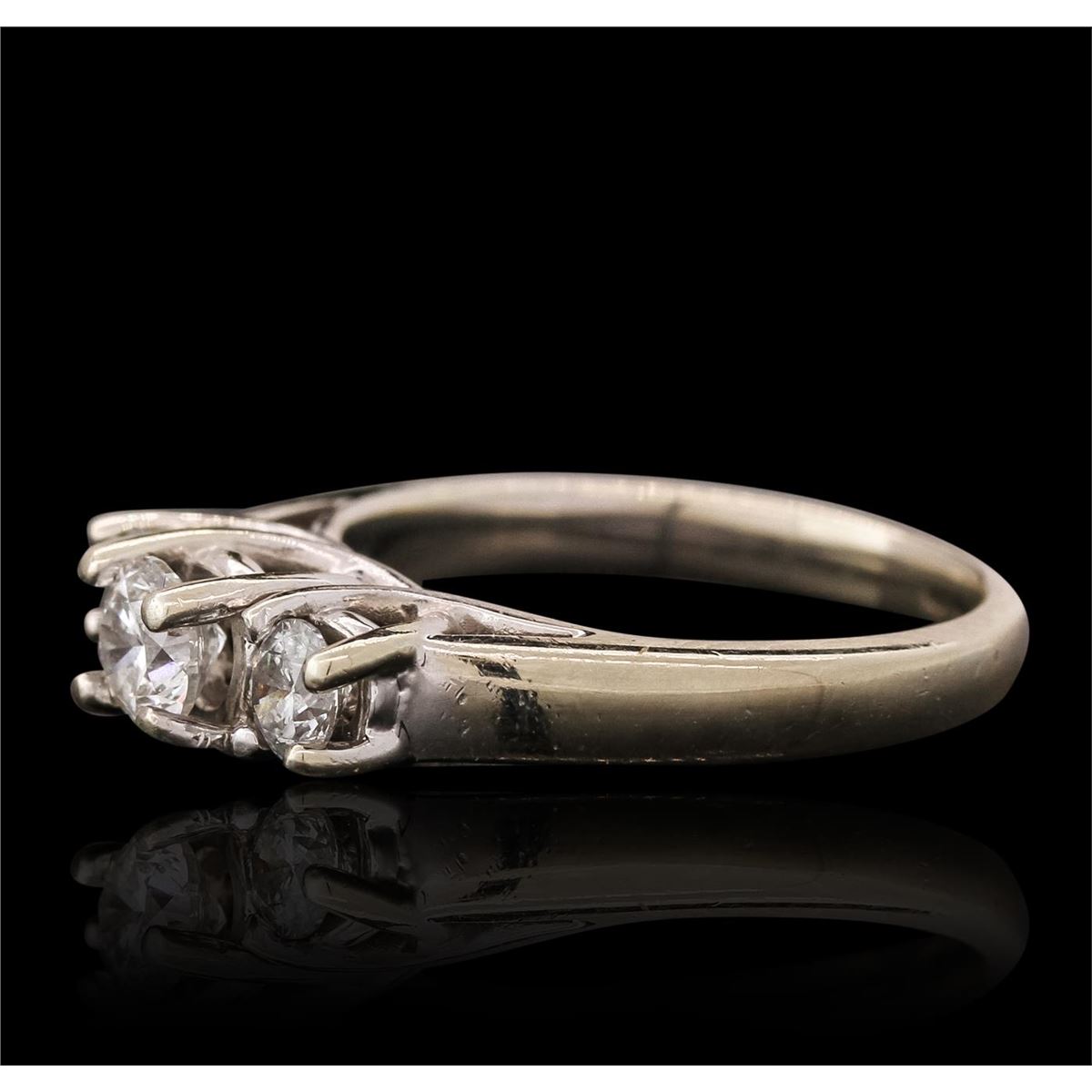 One electronically tested 14KT white gold ladies combination cast & assembled engagement ring with a bright polish finish. Identified with markings of "14K". Condition is very good. Containing: One prong set round brilliant cut diamond, measuring 4.86 - 4.86 x 2.92mm (depth est.) approximate weight of 0.42ct. Clarity: SI-2. Color: I, Cut is Good. Two prong set round brilliant cut diamonds, measuring 3.90 - 3.80 x 2.31mm (depth est.) approximate total weight of 2 Stones = 0.42ct. Clarity: SI-2 to I-1. Color: I - J, Cut is Good. All diamonds are graded in the mounting, unless otherwise stated. Total Weight of Diamonds 0.84ct. Total Weight of Ring 5.00 grams. GGL Appraised at $5,295.00.
