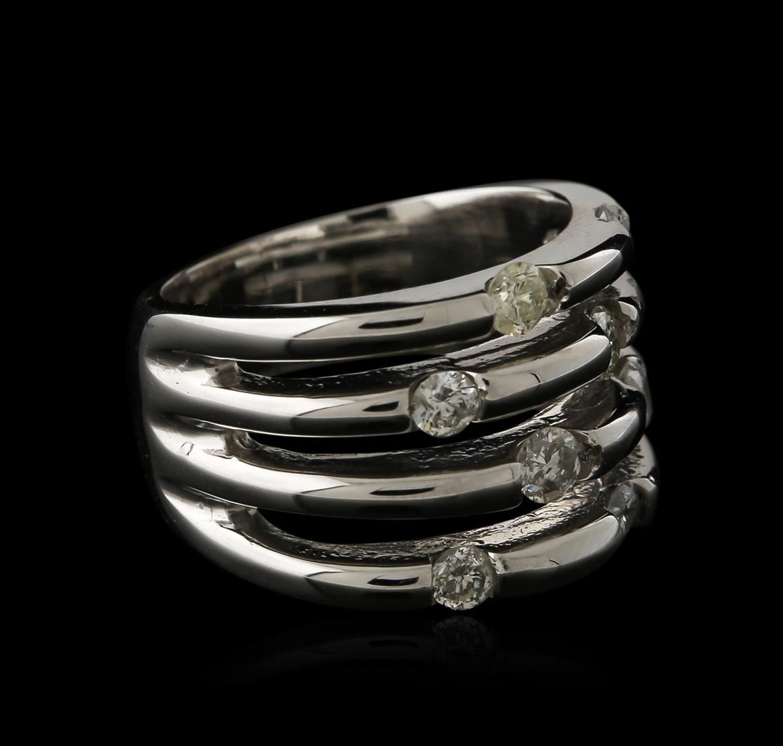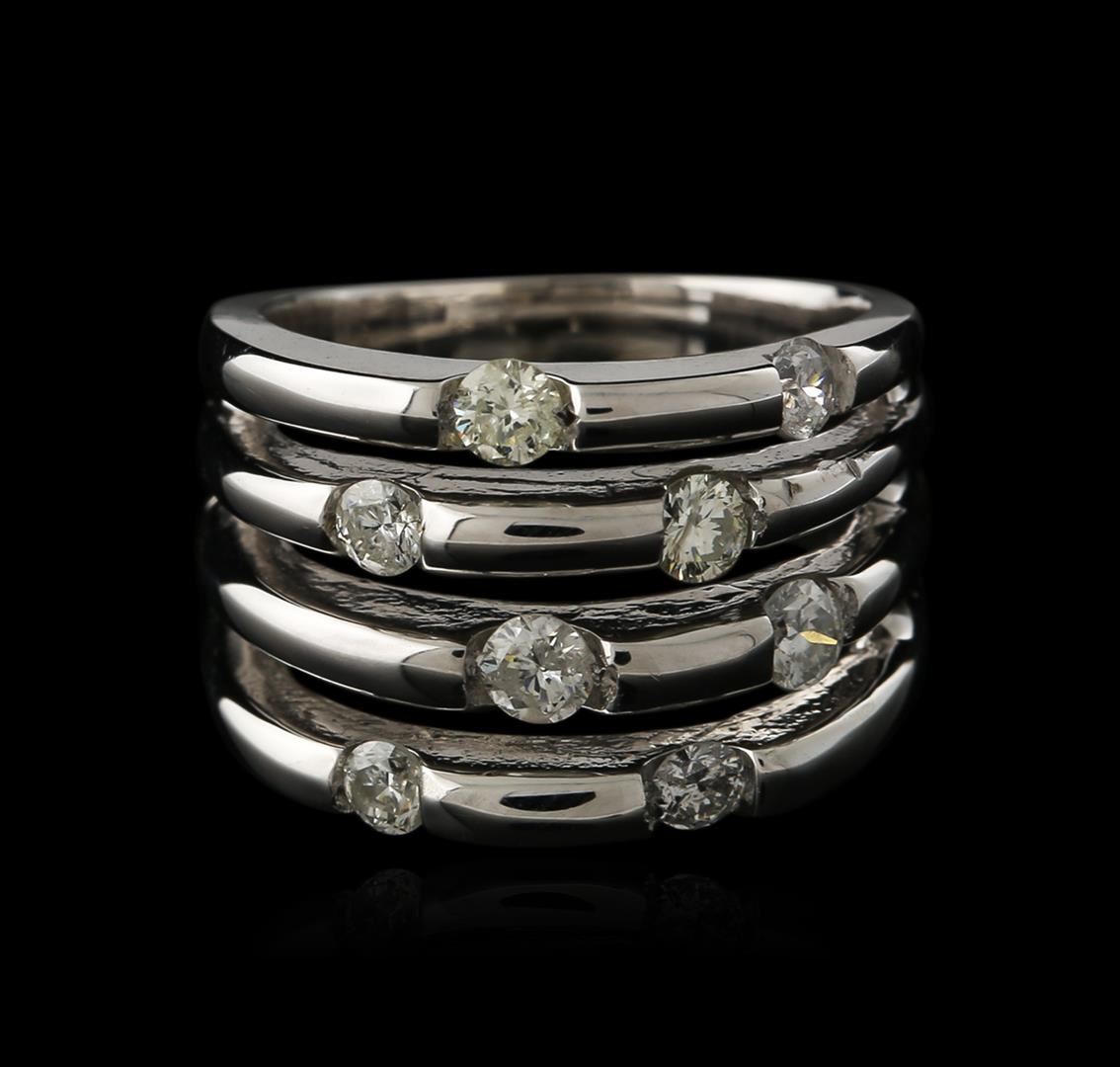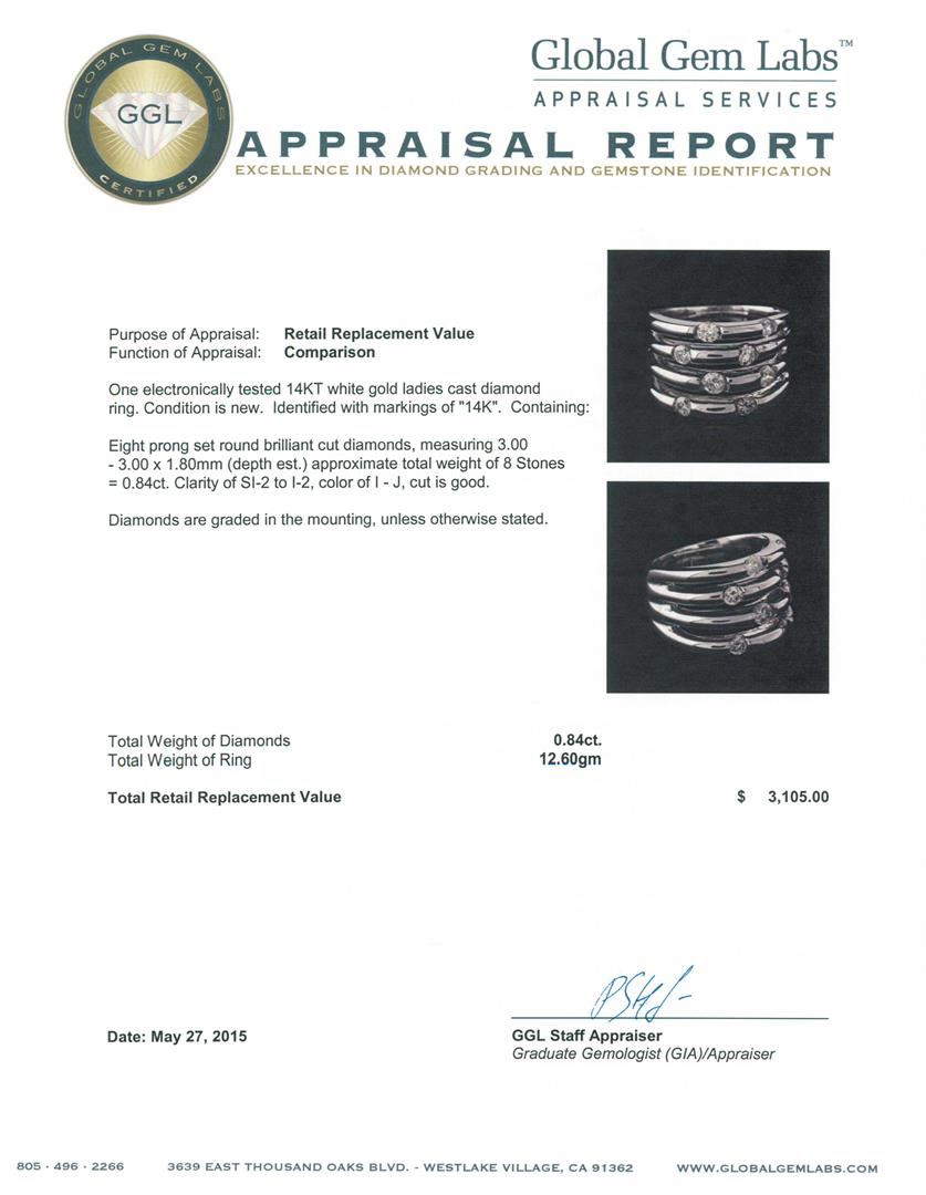 One electronically tested 14KT white gold ladies cast diamond ring. Identified with markings of "14K". Condition is new. Containing: Eight prong set round brilliant cut diamonds, measuring 3.00 - 3.00 x 1.80mm (depth est.) approximate total weight of 8 Stones = 0.84ct. Clarity: SI-2 to I-2. Color: I - J, Cut is Good. Diamonds are graded in the mounting, unless otherwise stated. Total Weight of Diamonds 0.84ct. Total Weight of Ring 12.60 grams. GGL Appraised at $3,105.00.