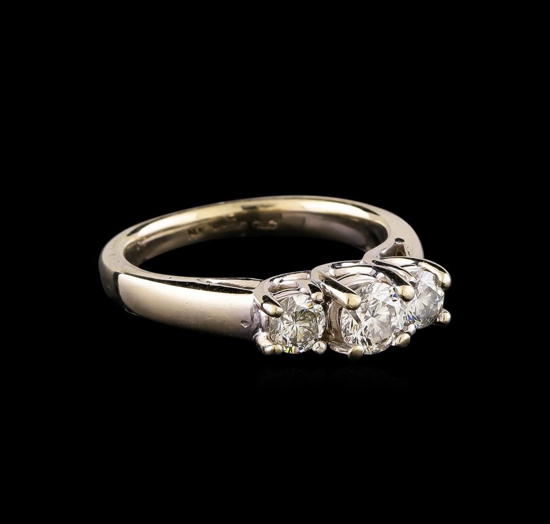One electronically tested 14KT white gold ladies combination cast & assembled engagement ring with a bright polish finish. Identified with markings of "14K". Condition is very good. Containing: One prong set round brilliant cut diamond, measuring 4.86 - 4.86 x 2.92mm (depth est.) approximate weight of 0.42ct. Clarity: SI-2. Color: I, Cut is Good. Two prong set round brilliant cut diamonds, measuring 3.90 - 3.80 x 2.31mm (depth est.) approximate total weight of 2 Stones = 0.42ct. Clarity: SI-2 to I-1. Color: I - J, Cut is Good. All diamonds are graded in the mounting, unless otherwise stated. Total Weight of Diamonds 0.84ct. Total Weight of Ring 5.00 grams. GGL Appraised at $5,295.00.