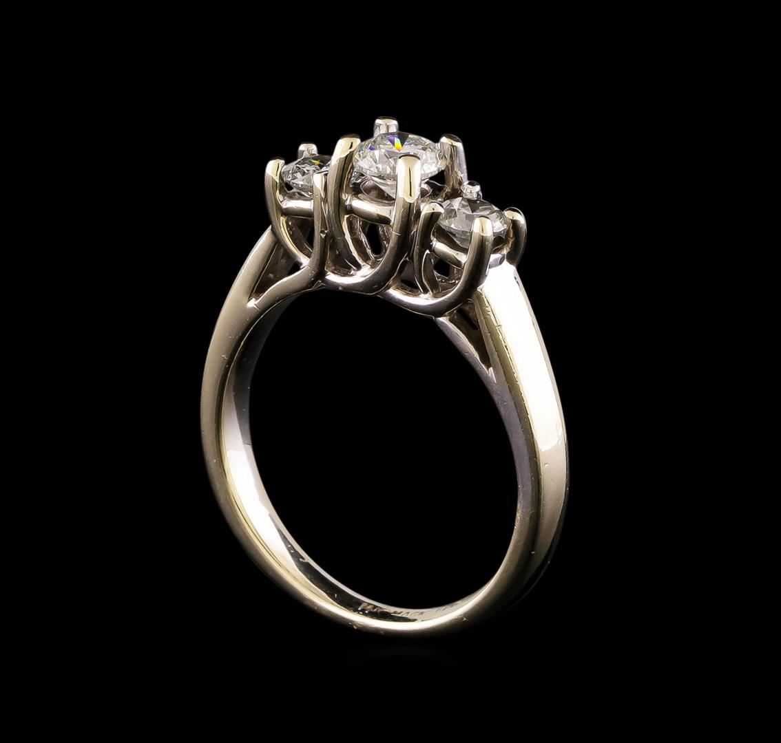 One electronically tested 14KT white gold ladies combination cast & assembled engagement ring with a bright polish finish. Identified with markings of "14K". Condition is very good. Containing: One prong set round brilliant cut diamond, measuring 4.86 - 4.86 x 2.92mm (depth est.) approximate weight of 0.42ct. Clarity: SI-2. Color: I, Cut is Good. Two prong set round brilliant cut diamonds, measuring 3.90 - 3.80 x 2.31mm (depth est.) approximate total weight of 2 Stones = 0.42ct. Clarity: SI-2 to I-1. Color: I - J, Cut is Good. All diamonds are graded in the mounting, unless otherwise stated. Total Weight of Diamonds 0.84ct. Total Weight of Ring 5.00 grams. GGL Appraised at $5,295.00.