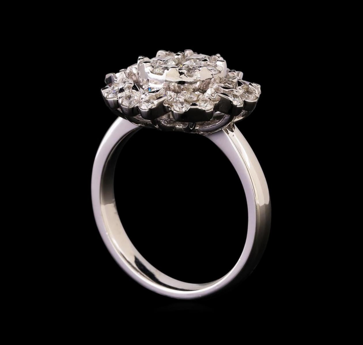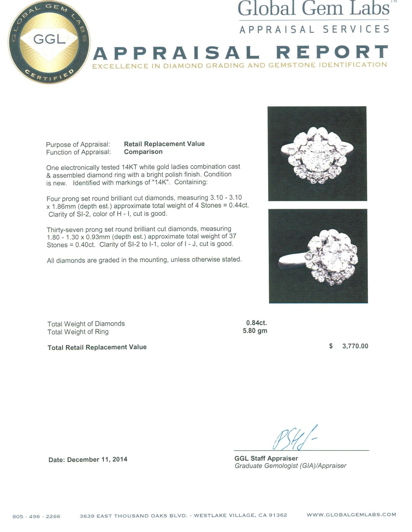 One electronically tested 14KT white gold ladies combination cast & assembled diamond ring with a bright polish finish. Identified with markings of "14K". Condition is new. Containing: Four prong set round brilliant cut diamonds, measuring 3.10 - 3.10 x 1.86mm (depth est.) approximate total weight of 4 Stones = 0.44ct. Clarity: SI-2. Color: H - I, Cut is Good. Thirty-Seven prong set round brilliant cut diamonds, measuring 1.80 - 1.30 x 0.93mm (depth est.) approximate total weight of 37 Stones = 0.40 ct. Clarity: SI-2 to I-1. Color: I - J, Cut is Good. All diamonds are graded in the mounting, unless otherwise stated. Total Weight of Diamonds 0.84ct. Total Weight of Ring 5.80 grams. GGL Appraised.