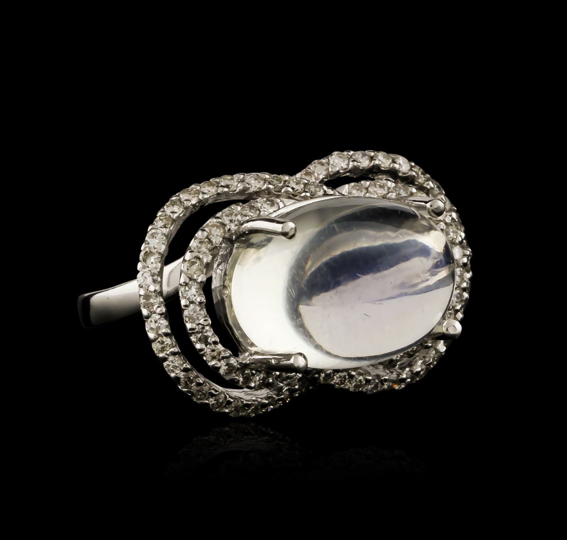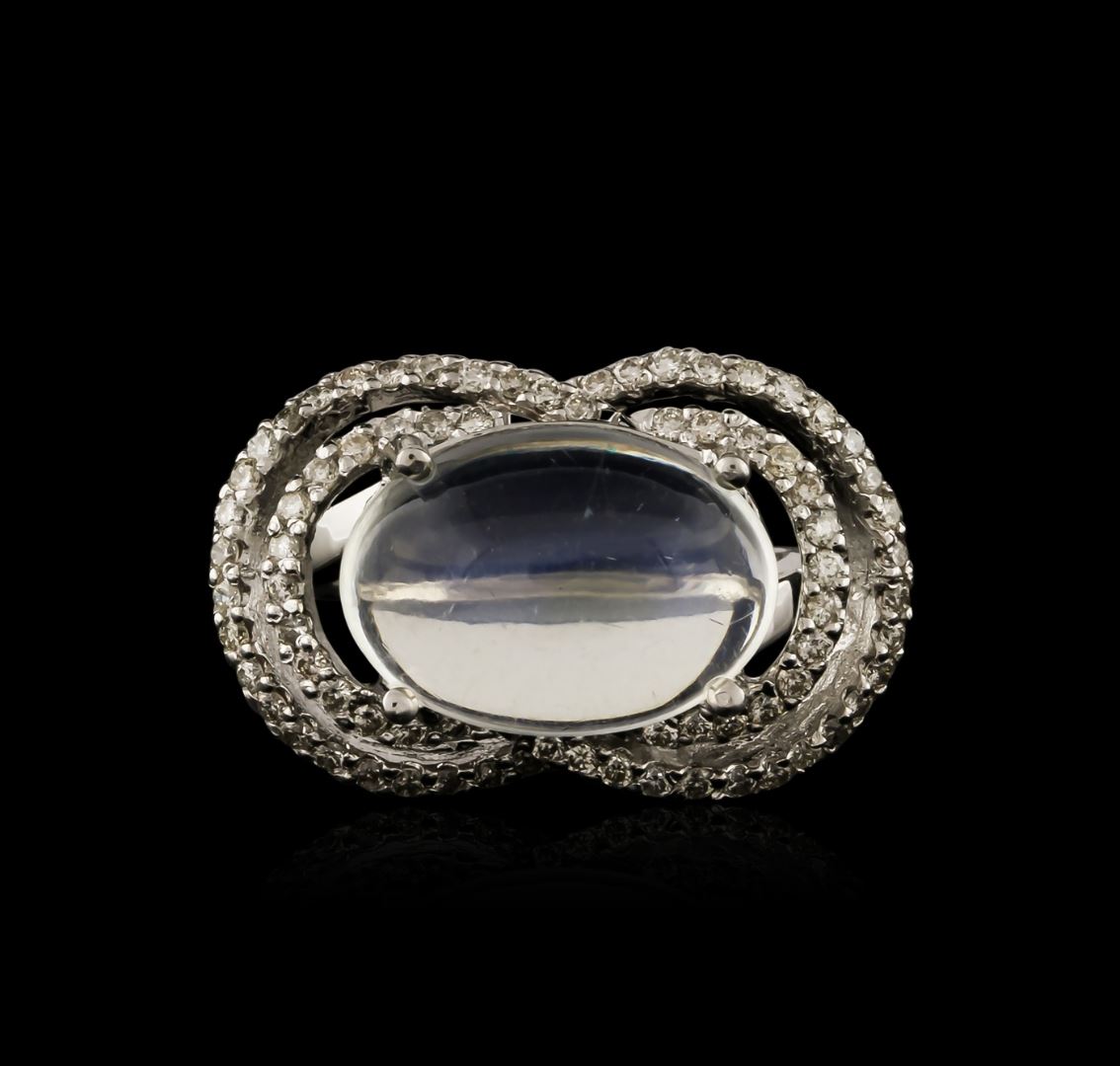One ring featuring: 14KT white gold weighing 9.80 grams containing one blue moonstone with a total weight of 0.84ct and prong set round diamonds with a total weight of 0.84ct.