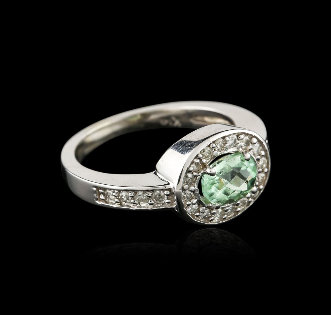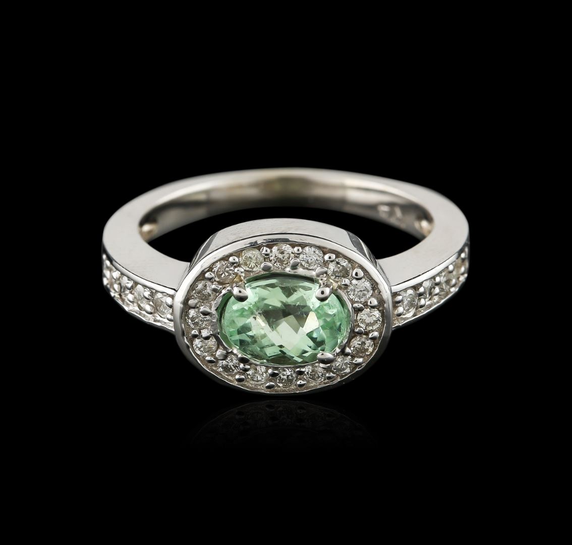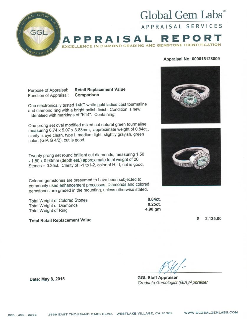 One electronically tested 14KT white gold ladies cast tourmaline and diamond ring with a bright polish finish. Identified with markings of "K14". Condition is new. Containing: One prong set oval modified mixed cut natural green tourmaline, measuring 6.74 x 5.07 x 3.83mm, approximate weight of 0.84ct., clarity is eye clean, type I, medium light, slightly grayish, green color, (GIA G 4/2), cut is good. Twenty prong set round brilliant cut diamonds, measuring 1.50 - 1.50 x 0.90mm (depth est.) approximate total weight of 20 Stones = 0.25ct. Clarity: I-1 to I-2. Color: H - I, Cut is Good. Colored gemstones are presumed to have been subjected to commonly used enhancement processes. Diamonds and colored gemstones are graded in the mounting, unless otherwise stated. Total Weight of Colored Stones 0.84ct. Total Weight of Diamonds 0.25ct. Total Weight of Ring 4.90 grams. GGL Appraised at $2,135.00.