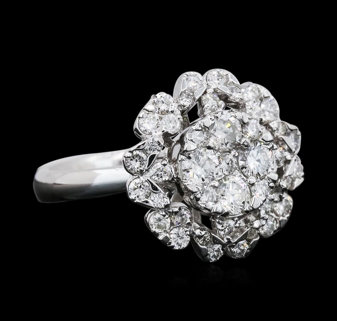 One electronically tested 14KT white gold ladies combination cast & assembled diamond ring with a bright polish finish. Identified with markings of "14K". Condition is new. Containing: Four prong set round brilliant cut diamonds, measuring 3.10 - 3.10 x 1.86mm (depth est.) approximate total weight of 4 Stones = 0.44ct. Clarity: SI-2. Color: H - I, Cut is Good. Thirty-Seven prong set round brilliant cut diamonds, measuring 1.80 - 1.30 x 0.93mm (depth est.) approximate total weight of 37 Stones = 0.40ct. Clarity: SI-2 to I-1. Color: I - J, Cut is Good. All diamonds are graded in the mounting, unless otherwise stated. Total Weight of Diamonds 0.84ct. Total Weight of Ring 5.80 grams. GGL Appraised at $3,770.00.