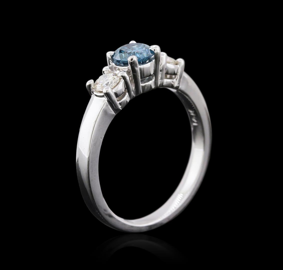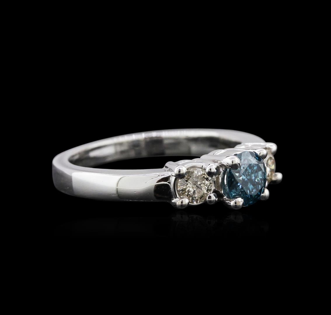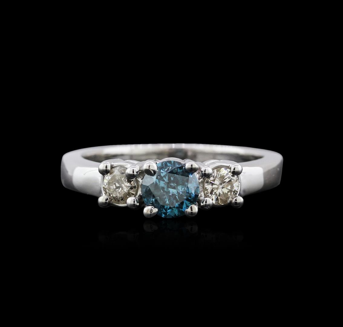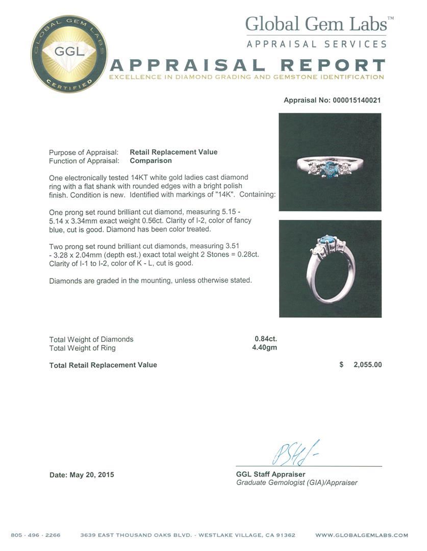 One electronically tested 14KT white gold ladies cast diamond ring with a flat shank with rounded edges with a bright polish finish. Identified with markings of "14K". Condition is new. Containing: One prong set round brilliant cut diamond, measuring 5.15 - 5.14 x 3.34mm exact weight 0.56ct. Clarity: I-2, Cut is Good. Diamond has been color treated. Two prong set round brilliant cut diamonds, measuring 3.51 - 3.28 x 2.04mm (depth est.) exact total weight 2 Stones = 0.28ct. Clarity: I-1 to I-2. Color: K - L, Cut is Good. Diamonds are graded in the mounting, unless otherwise stated. Total Weight of Diamonds 0.84ct. Total Weight of Ring 4.40 grams. GGL Appraised at $2,055.00.