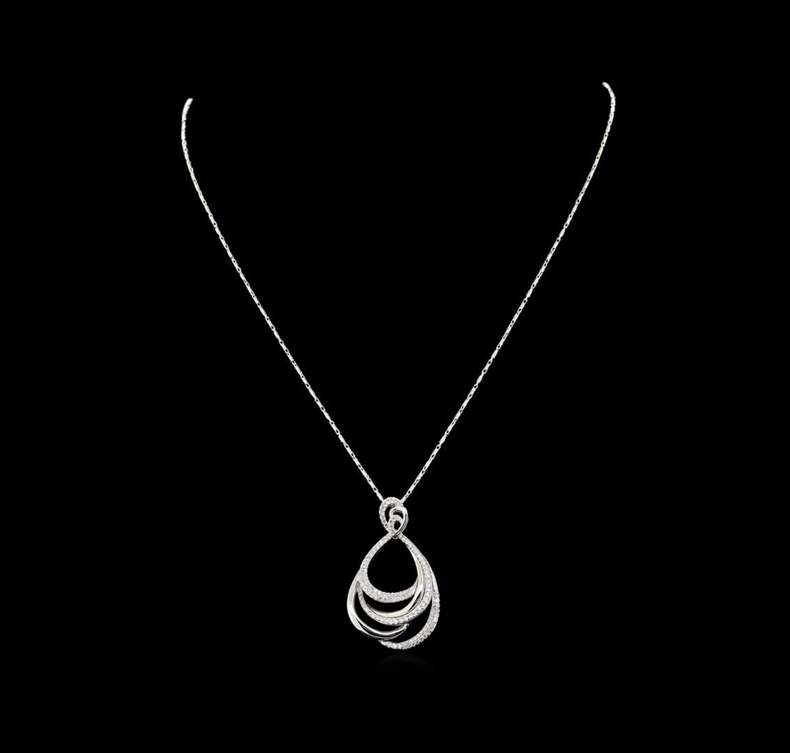 One electronically tested 14KT white gold ladies cast diamond pendant & chain 18.0" long, fancy link with a lobster claw clasp with a bright polish finish. Measurements: 18" in length Identified with markings of "K14". Condition is new. Containing: One Hundred Six prong set round brilliant cut diamonds, measuring 1.30 - 1.30 x 0.78mm (depth est.) approximate total weight of 106 Stones = 0.85ct. Clarity: I-1 to I-2. Color: I - J, Cut is Good. All diamonds are graded in the mounting, unless otherwise stated. Total Weight of Diamonds 0.85ct. Total Weight of Pendant & Chain 11.60 grams. GGL Appraised at $5,625.00.